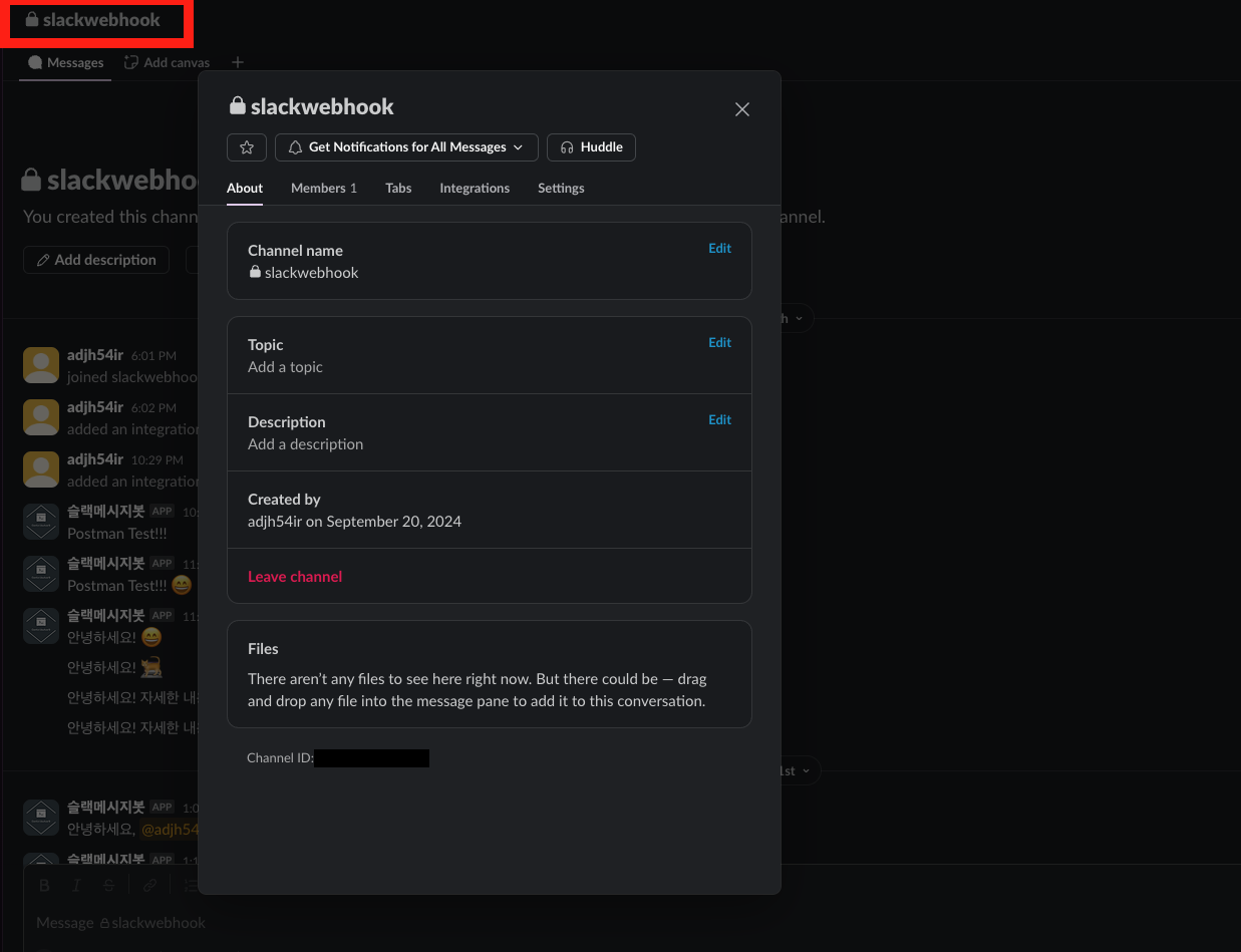 - Slack 채널을 선택하면 아래와 같이 채널아이디를 확인할 수 있습니다.