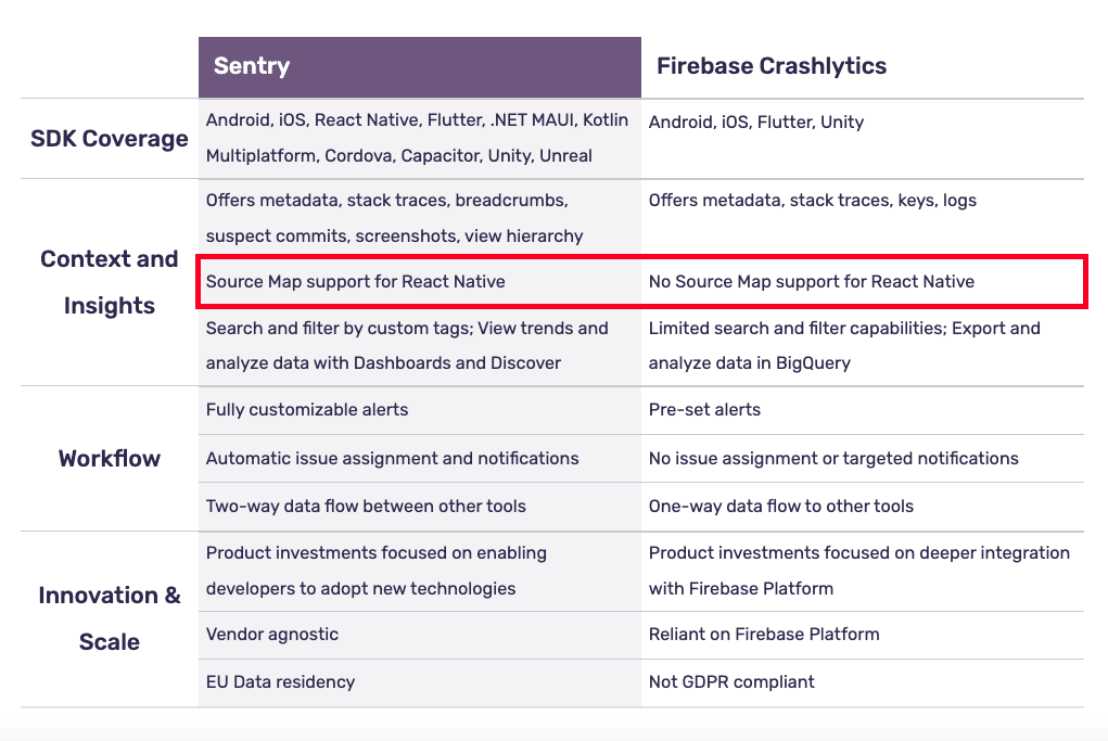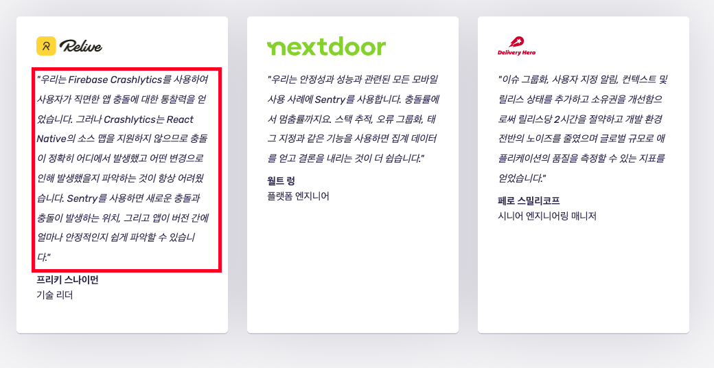 - "우리는 Firebase Crashlytics를 사용하여 사용자가 직면한 앱 충돌에 대한 통찰력을 얻었습니다. 그러나 Crashlytics는 React Native의 소스 맵을 지원하지 않으므로 충돌이 정확히 어디에서 발생했고 어떤 변경으로 인해 발생했을지 파악하는 것이 항상 어려웠습니다. Sentry를 사용하면 새로운 충돌과 충돌이 발생하는 위치, 그리고 앱이 버전 간에 얼마나 안정적인지 쉽게 파악할 수 있습니다.”