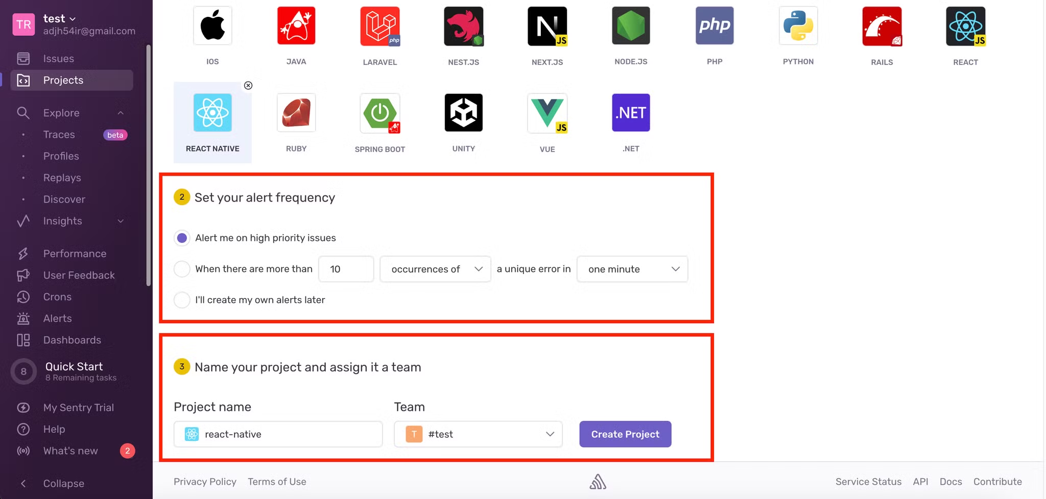 4. 알람빈도(Set your alert frequency)와 프로젝트 이름과 팀(Name your project and assign it a team)을 지정하여 프로젝트를 생성합니다.
