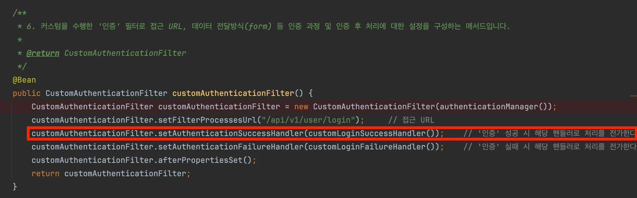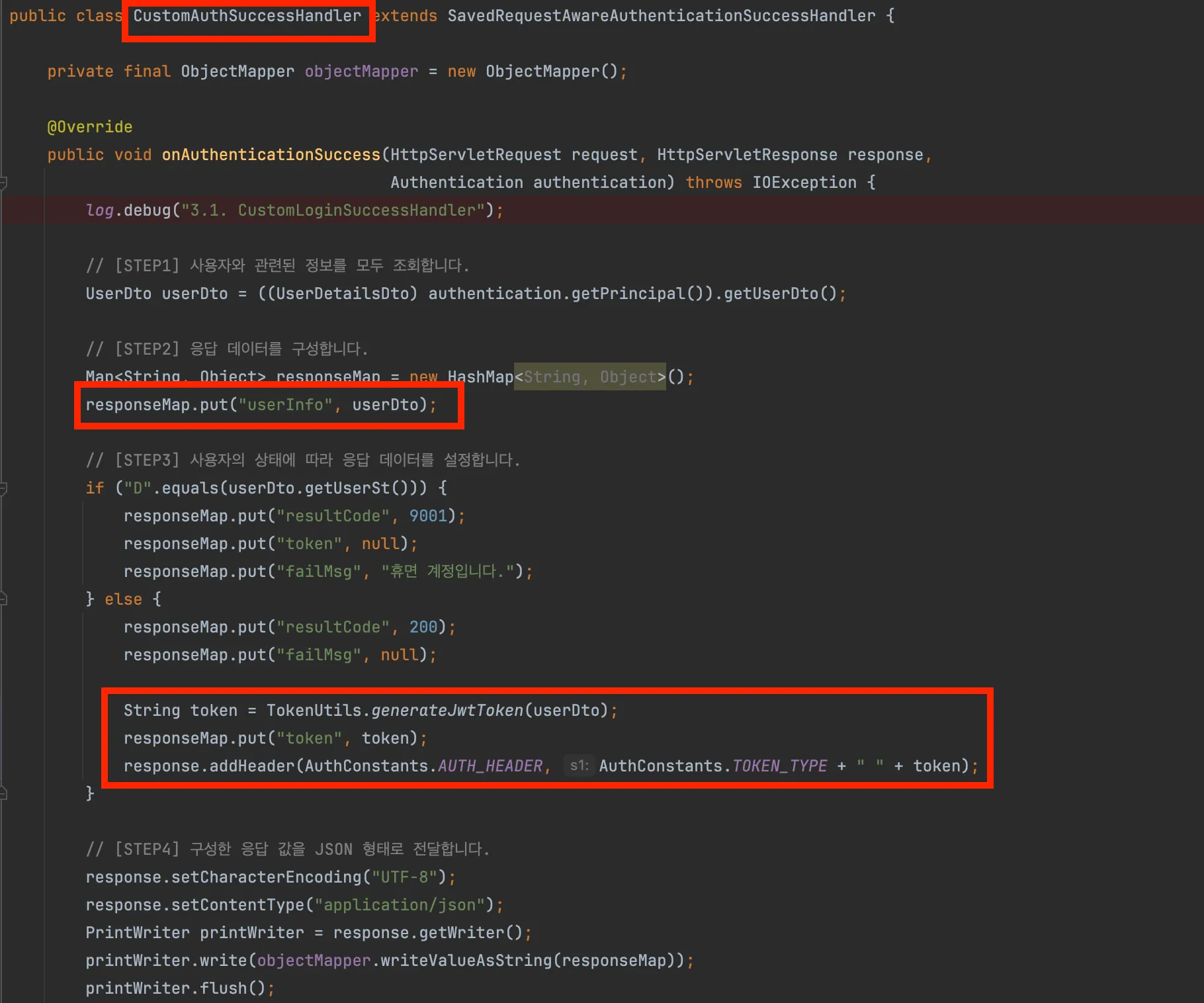- 아래의 customLoginSuccessHandler 내에서는 성공에 대한 응답 값(사용자 정보, JWT)을 구성해서 반환해 줍니다.