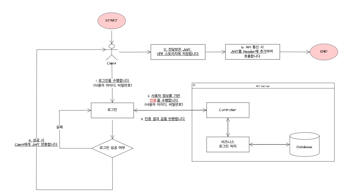 1. Client는 로그인을 수행합니다. - 사용자 아이디, 비밀번호를 기준으로 로그인을 수행합니다.