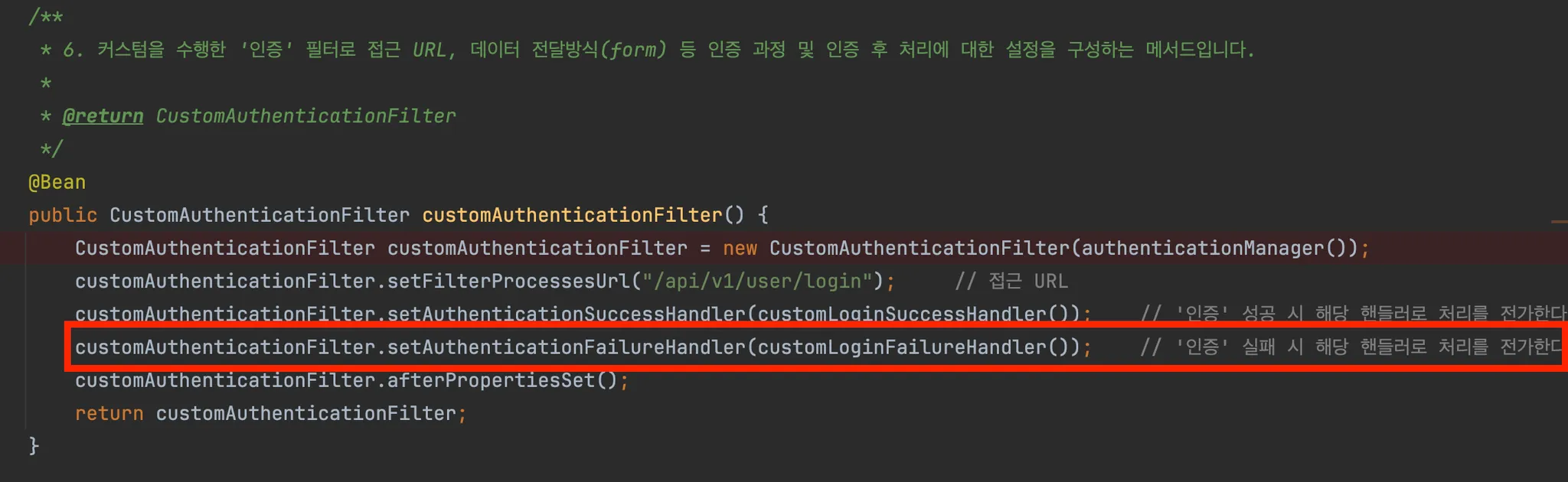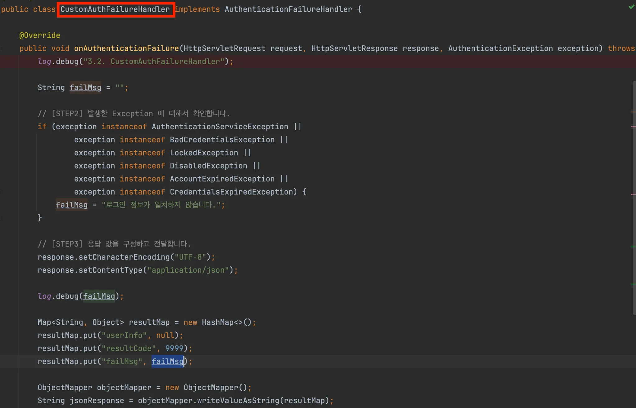 - 아래의 customLoginFailureHandler 내에서는 실패에 대한 응답 값을 구성해서 반환해 줍니다.