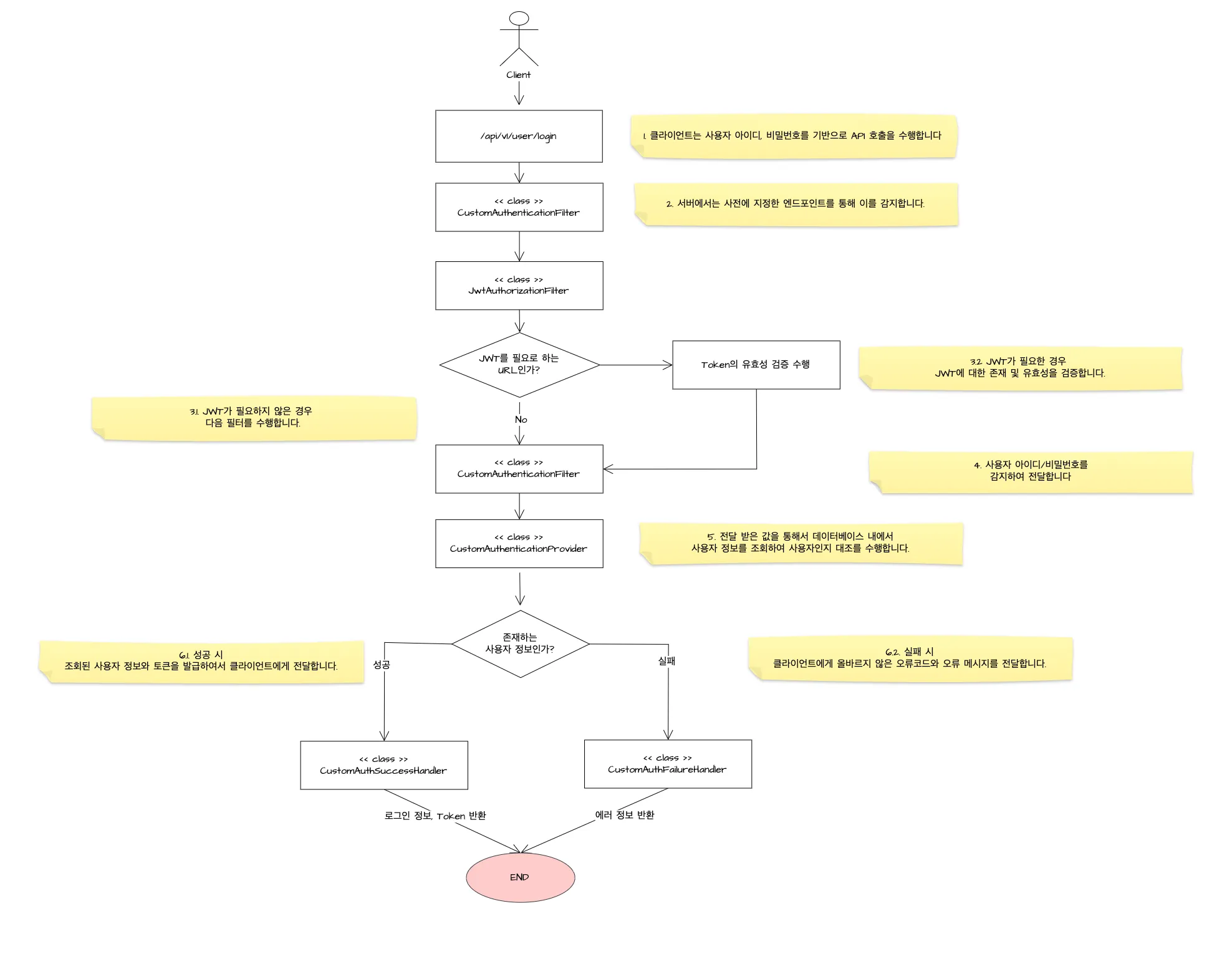 1. 클라이언트의 API 호출 : 엔드포인트(api/v1/user/login) - 클라이언트는 사용자 아이디, 비밀번호를 기반으로 API 호출을 수행합니다.