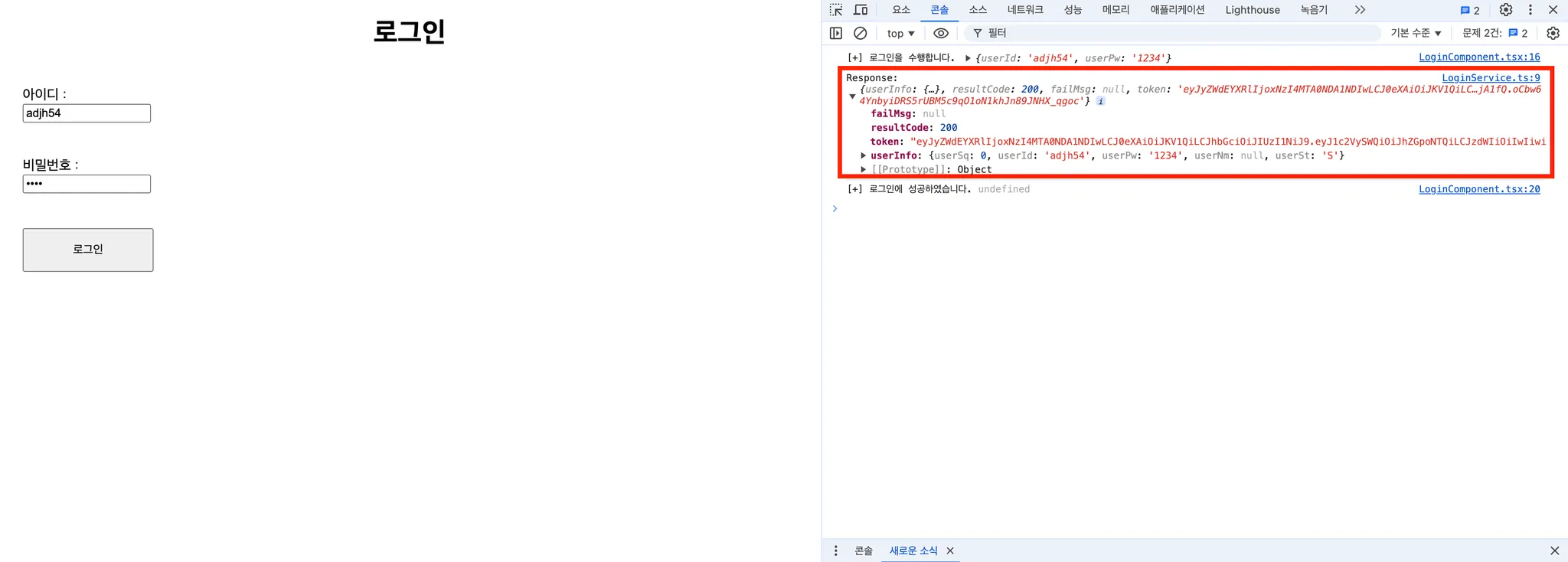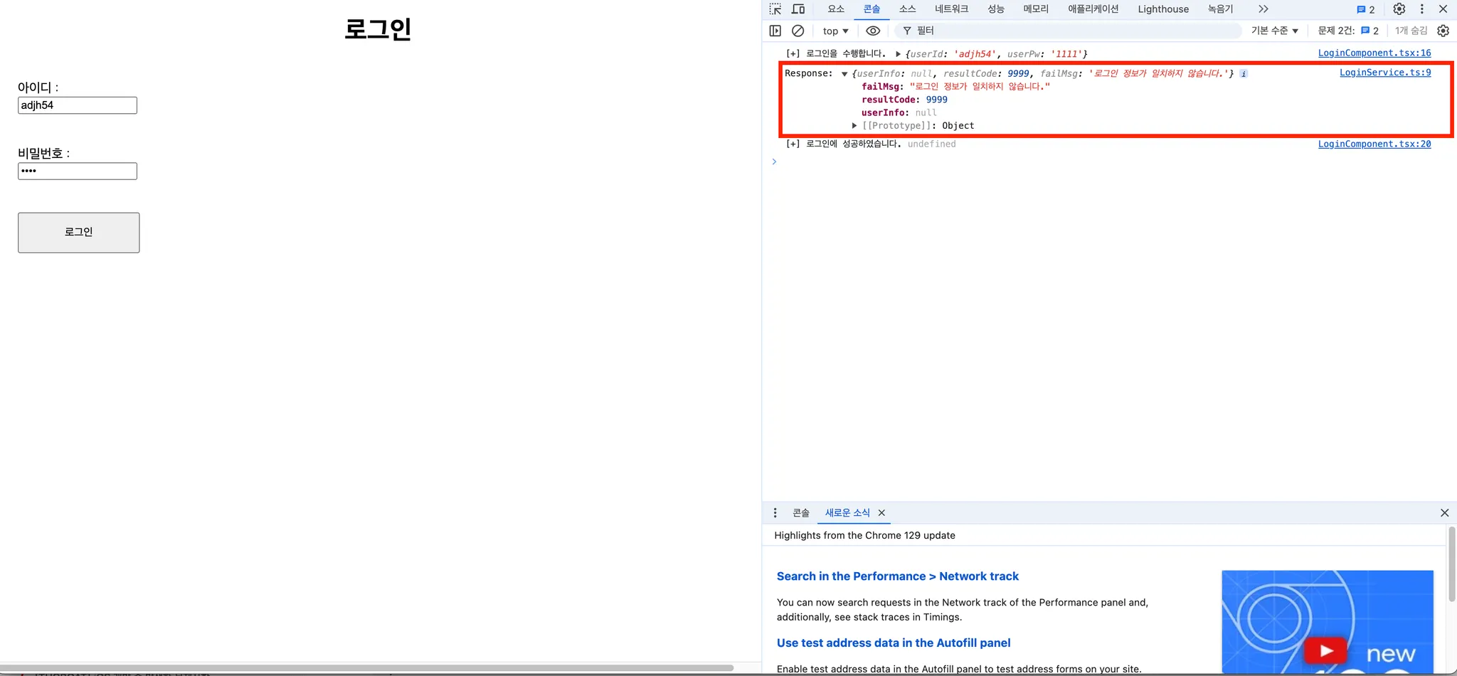 - 로그인 실패를 하는 경우 resultCode : 9999라는 값을 통해서 오류 메시지와 함께 응답이 되도록 처리하였습니다.
