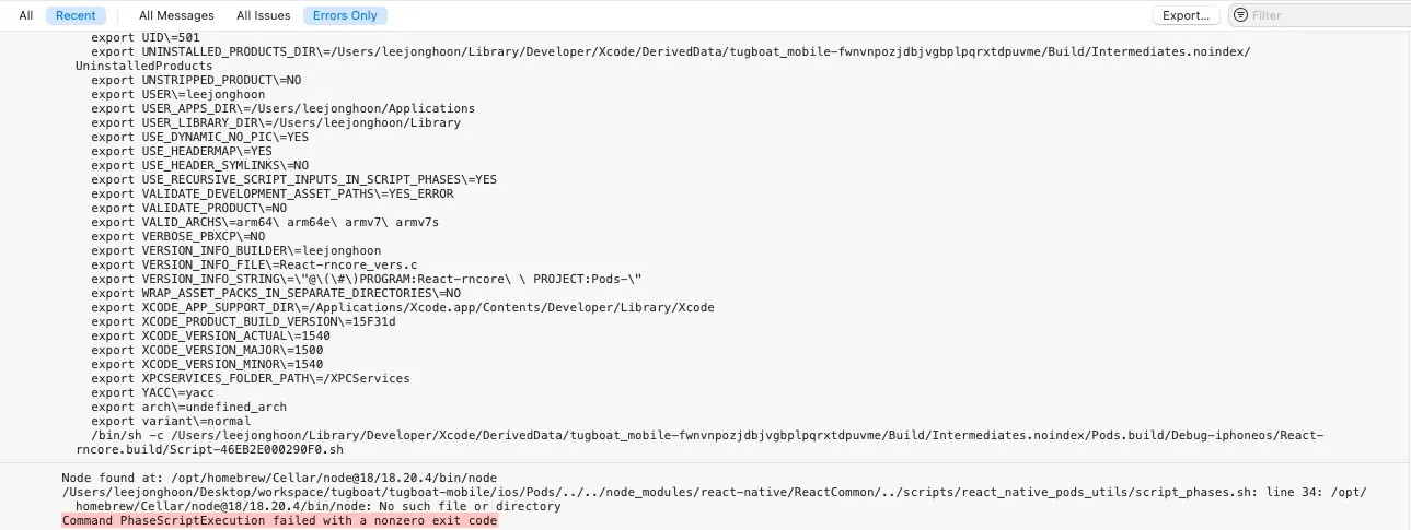 💡 오류내용 - XCode를 실행하는 중에 Command PhaseScriptExecution failed with a nonzero exit code와 같은 오류가 발생하였습니다. - 상세내용은 아래와 같고 결론적으로는 ‘경로의 문제’ 임을 확인되었습니다.