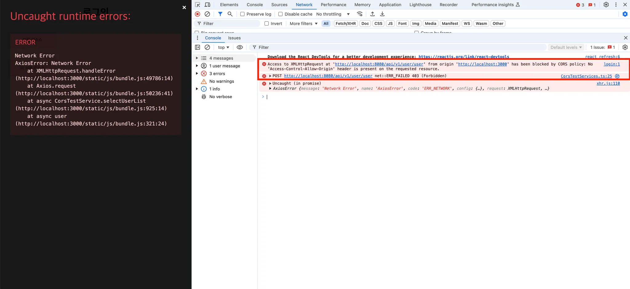 💡아래와 같은 403 오류가 발생하였습니다. - 호출되는 브라우저는 3000 포트이기에 허용되는 포트가 아니어서 아래와 같은 오류가 발생하였습니다.