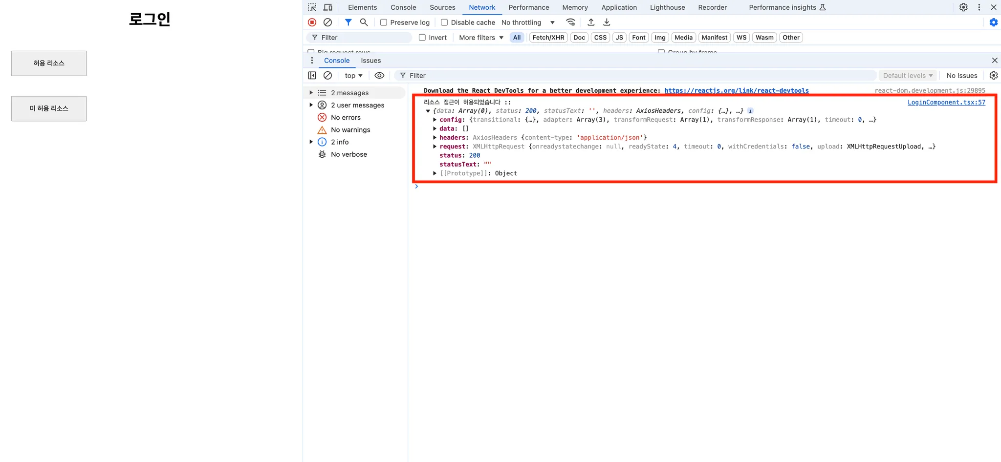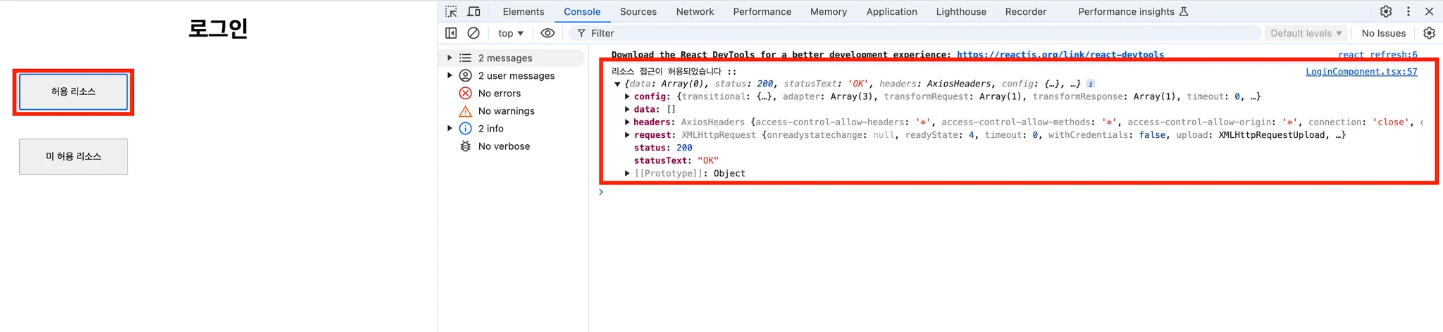 - http://localhost:3000 내에서 호출되었기에 해당 Endpoint의 경우 이에 대해 허용이 되었기에 리소스 응답 값을 반환받았습니다.
