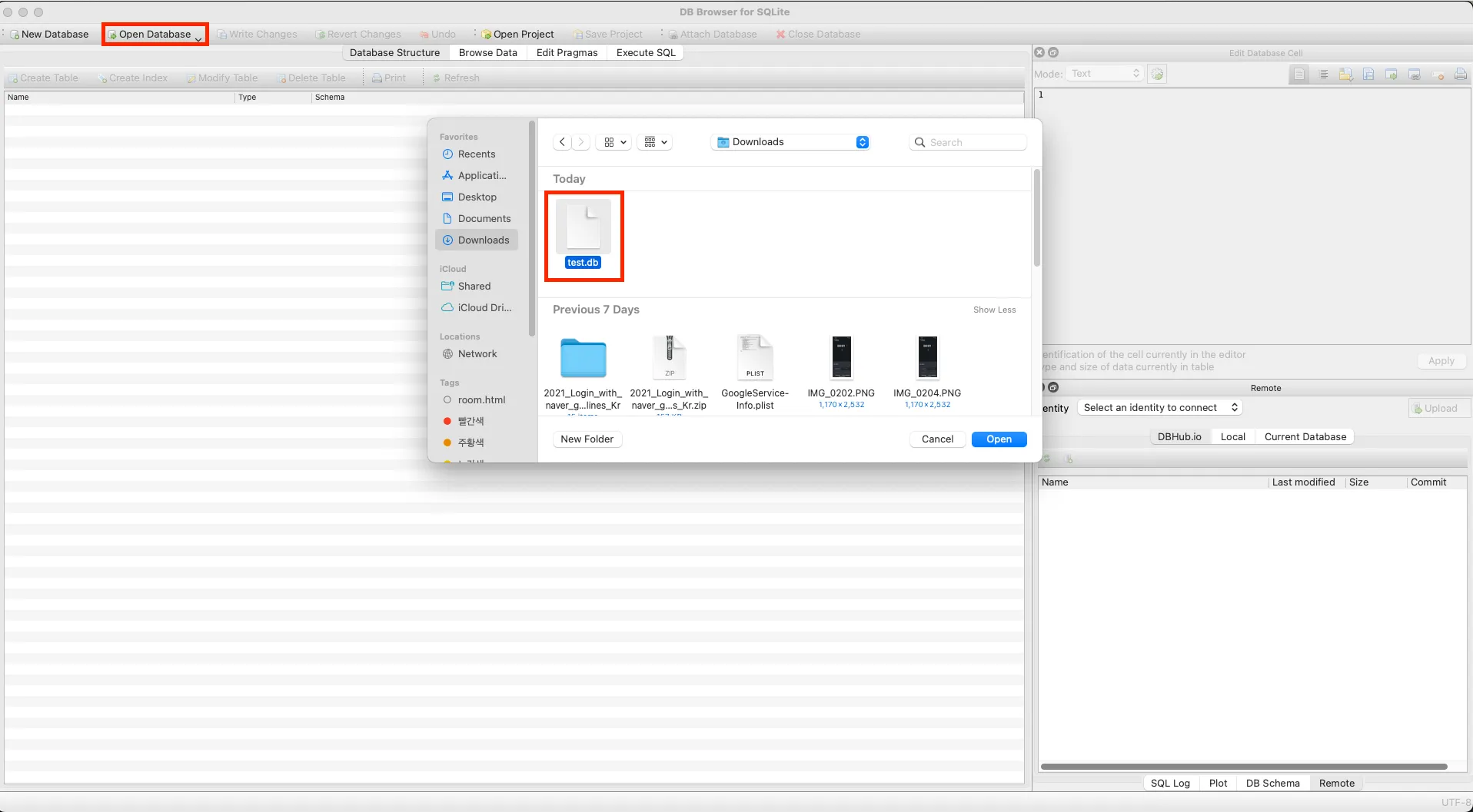 2. DB Browser for SQLite를 실행하고 Open Database 버튼을 눌러서 .db 파일을 열어줍니다.