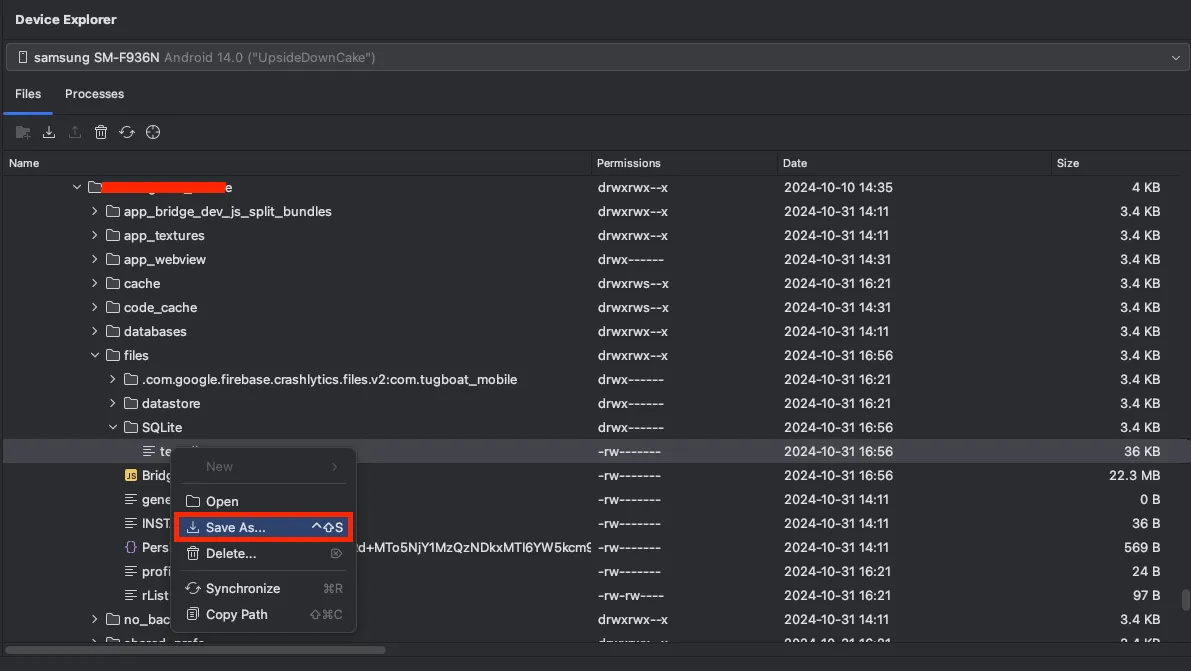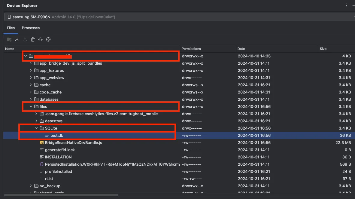 4. 프로젝트 패키지 > files > SQLite > .db 파일을 확인할 수 있습니다.