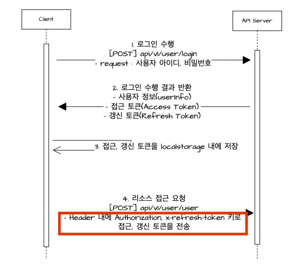 1. 클라이언트는 API Server로 리소스를 요청합니다. - 요청 시 Header 내에 Authorization로 접근 토큰(Access Token)을 보내며, x-refresh-token로 갱신 토큰(Refresh Token)을 함께 전달합니다.