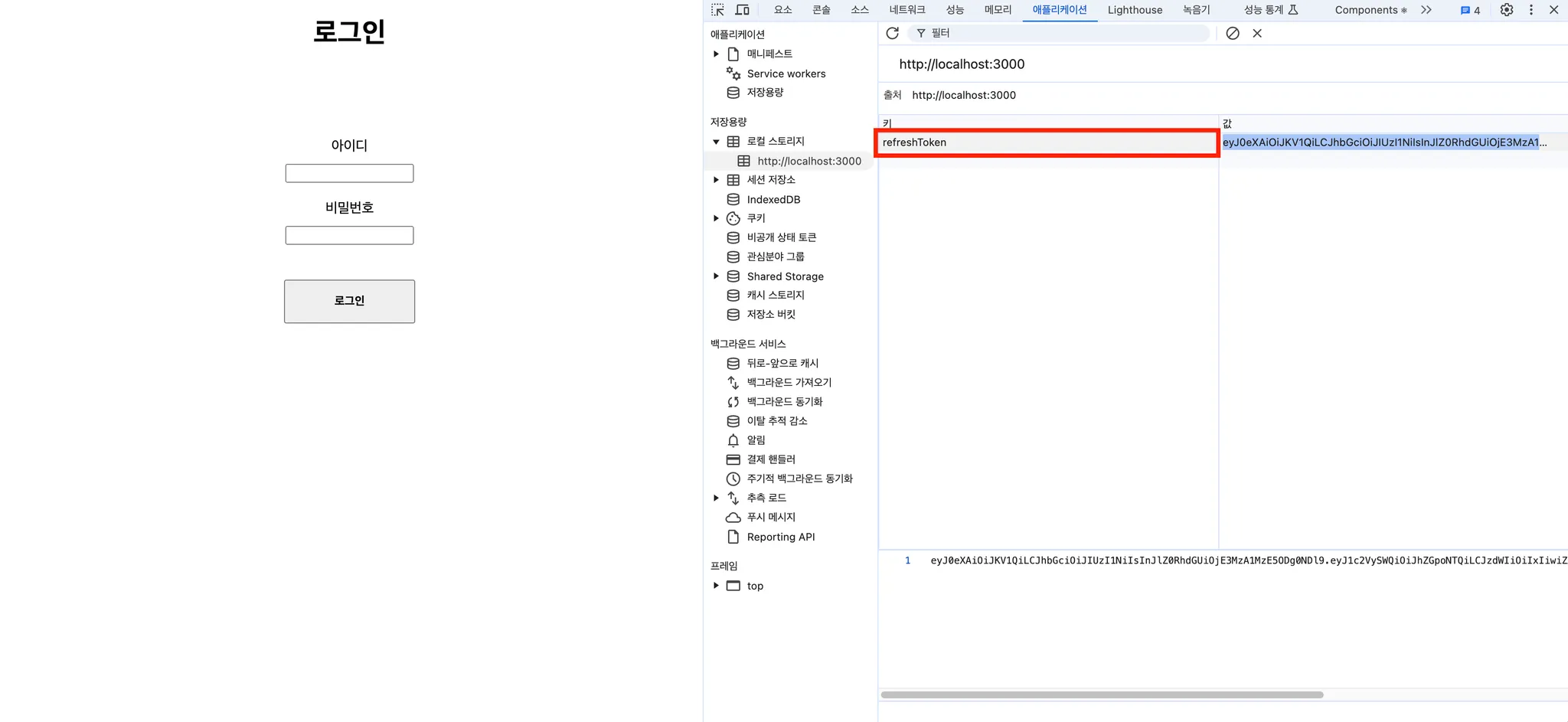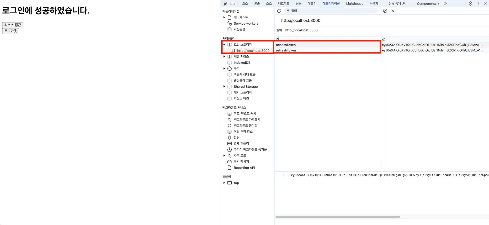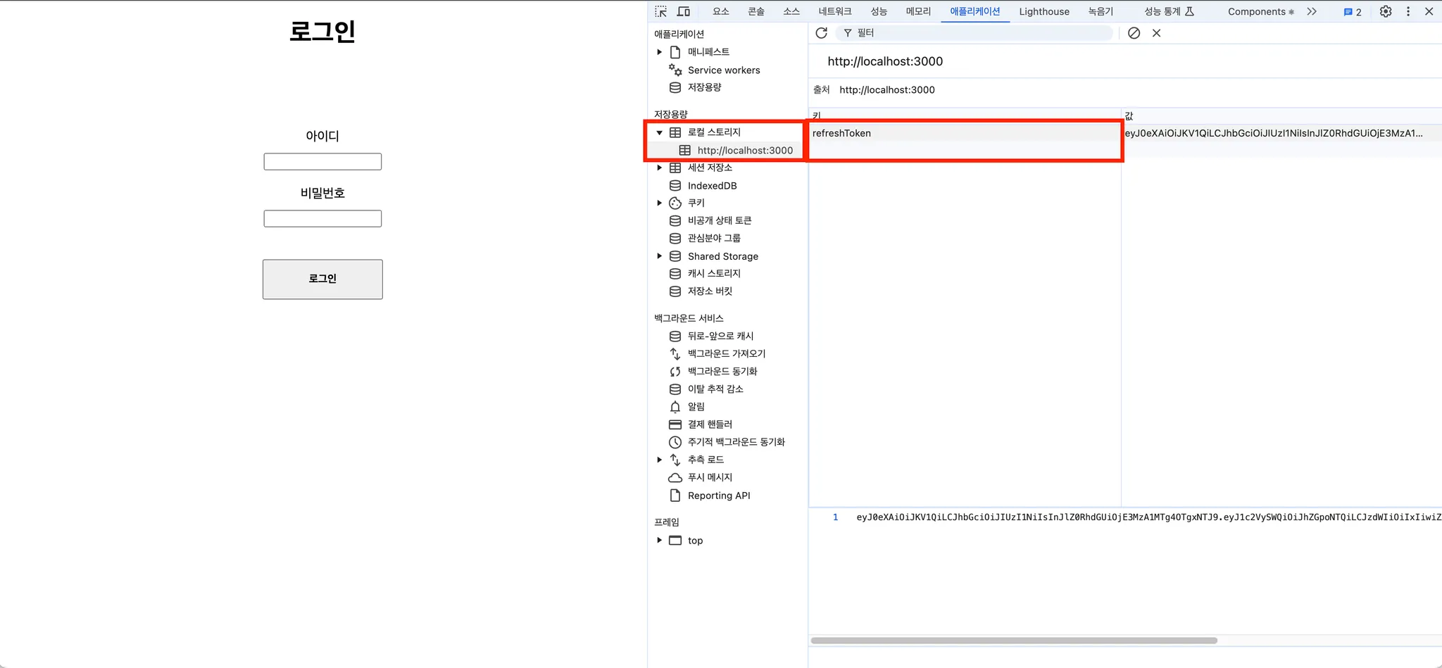 - 클라이언트에서 로그인을 하는 경우 아래와 같이 로컬 스토리지 내에 accessToken, refreshToken 형태로 저장이 되었습니다.