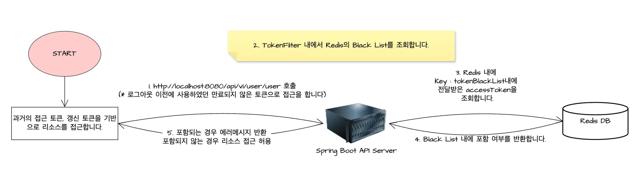 - 해당 경우는 과거에 로그아웃 하기 이전 로그인 당시에 발급받은 접근 토큰(Aceess Token)을 기반으로 리소스를 접근했을 때, 처리과정에 대해 알아봅니다.