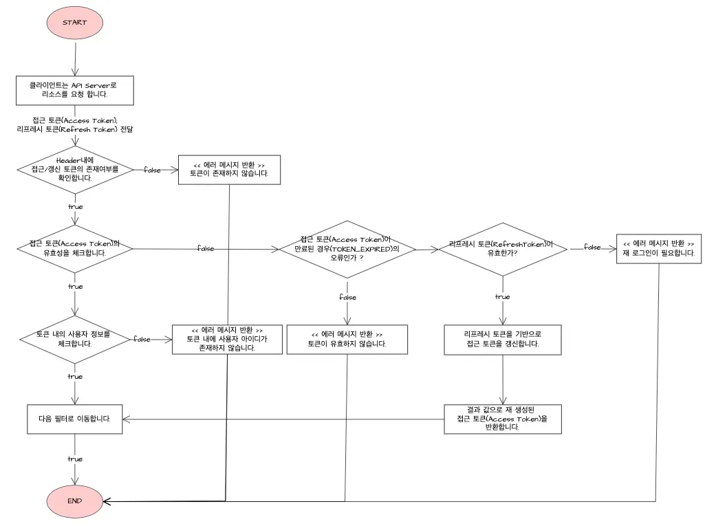 6. 리프레시 토큰(Refresh Token)이 유효한지 체크를 합니다. - 6.1. 리프레시 토큰이 유효하다면 접근 토큰을 갱신합니다. 갱신하여 재 생성된 접근 토큰을 반환합니다. - 6.2. 리프레시 토큰이 유효하지 않다면 에러 메시지를 클라이언트에게 전달합니다.
