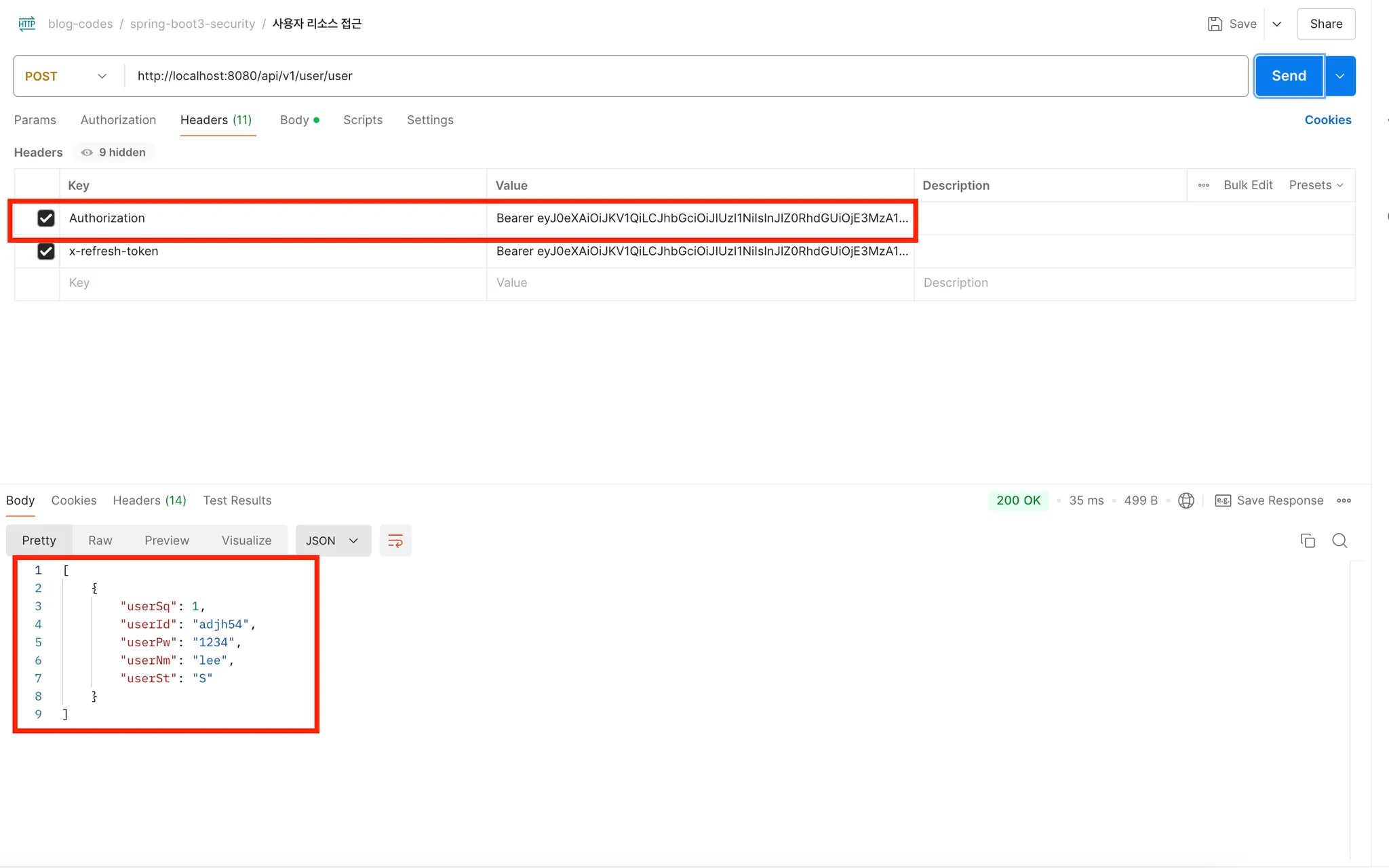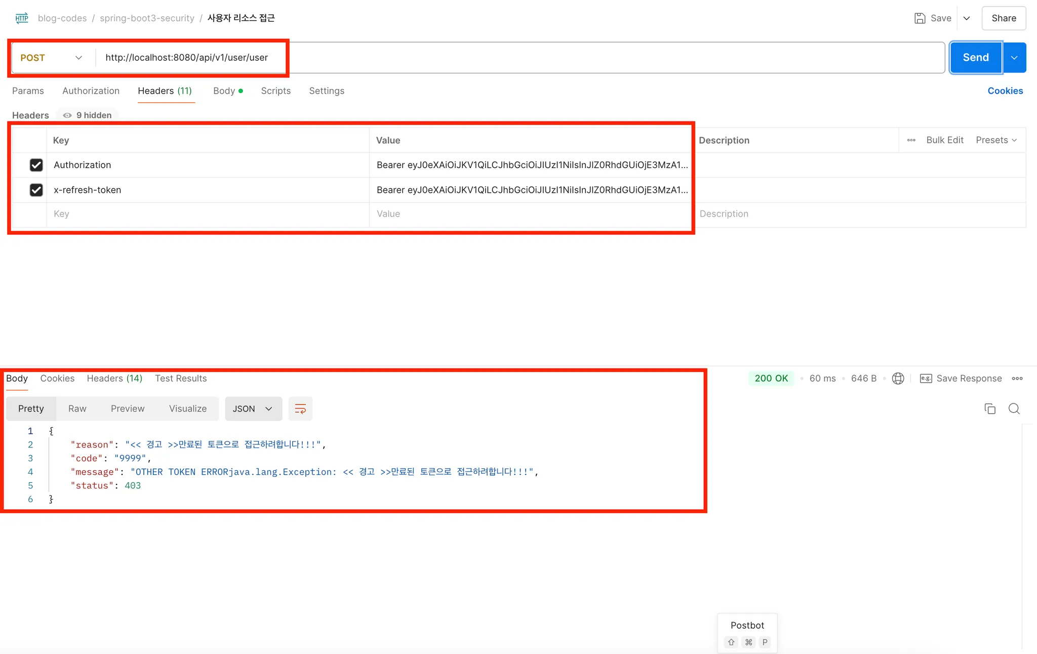 1. 과거의 접근 토큰, 갱신 토큰을 기반으로 리소스를 접근합니다. - http://localhost:8080/api/v1/user/user 호출 (* 로그아웃 이전에 사용하였던 만료되지 않은 토큰으로 접근을 합니다.)