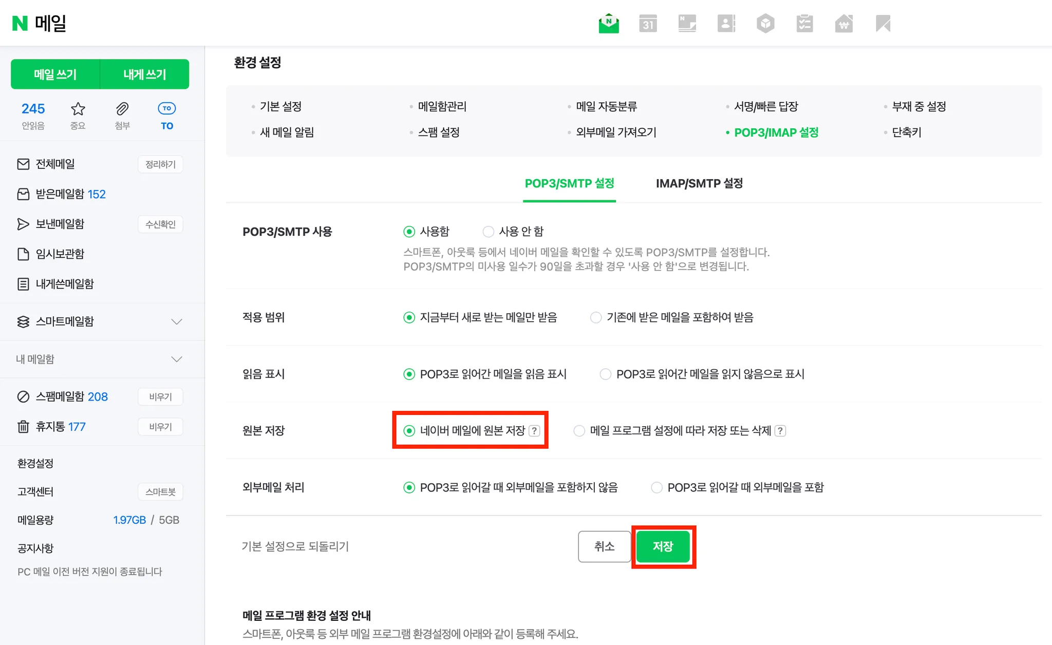 3. 원본 저장 부분에서 ‘네이버 메일에 원본 저장’ 체크박스를 누르고 저장합니다.