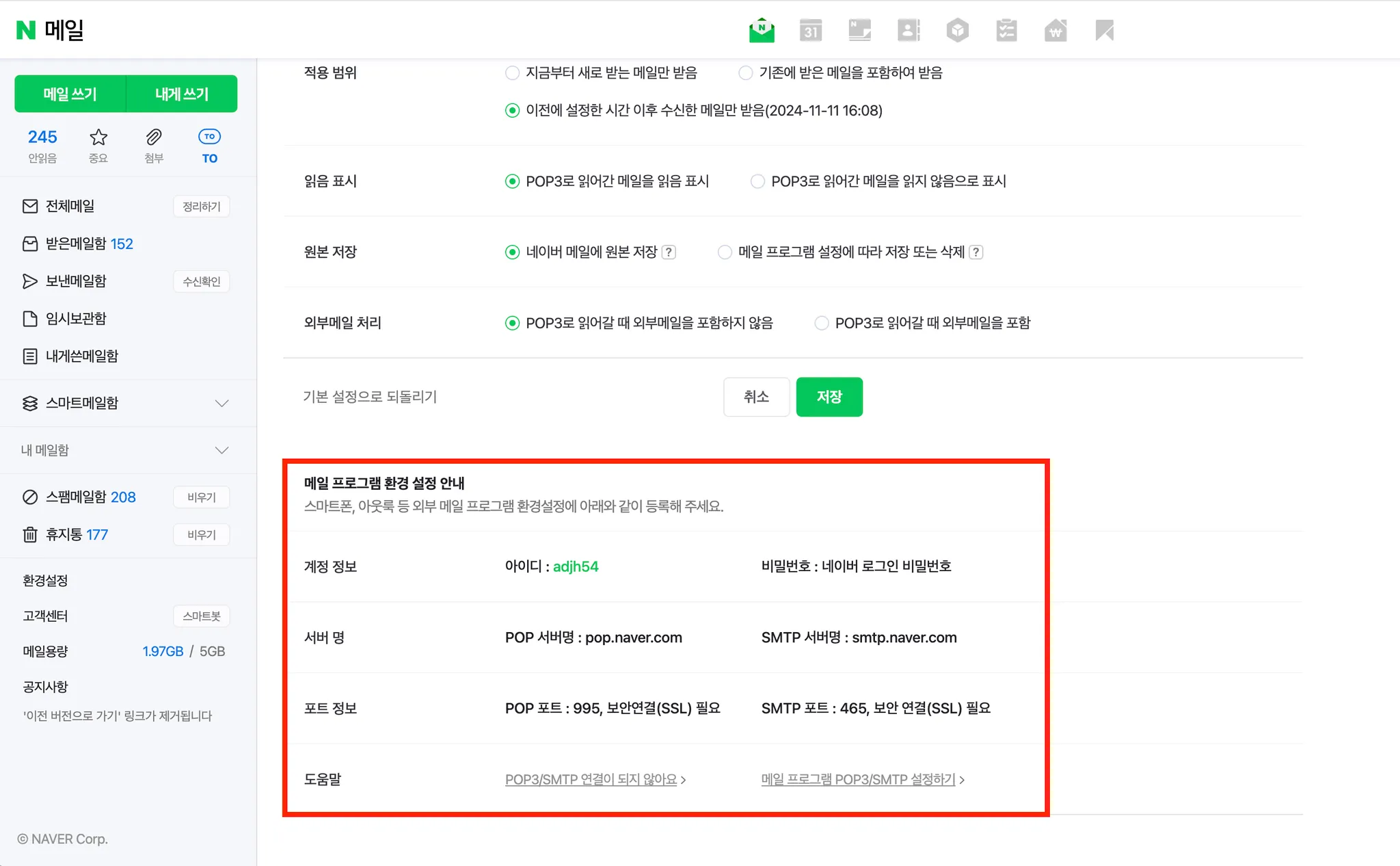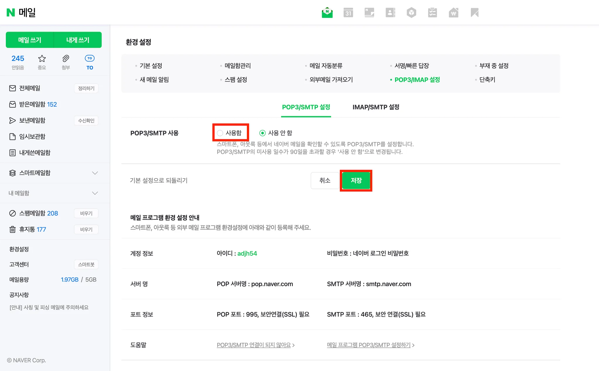 2. POP3/IMAP 설정 > POP3/ISMTP 내에서 '사용함'을 선택합니다.