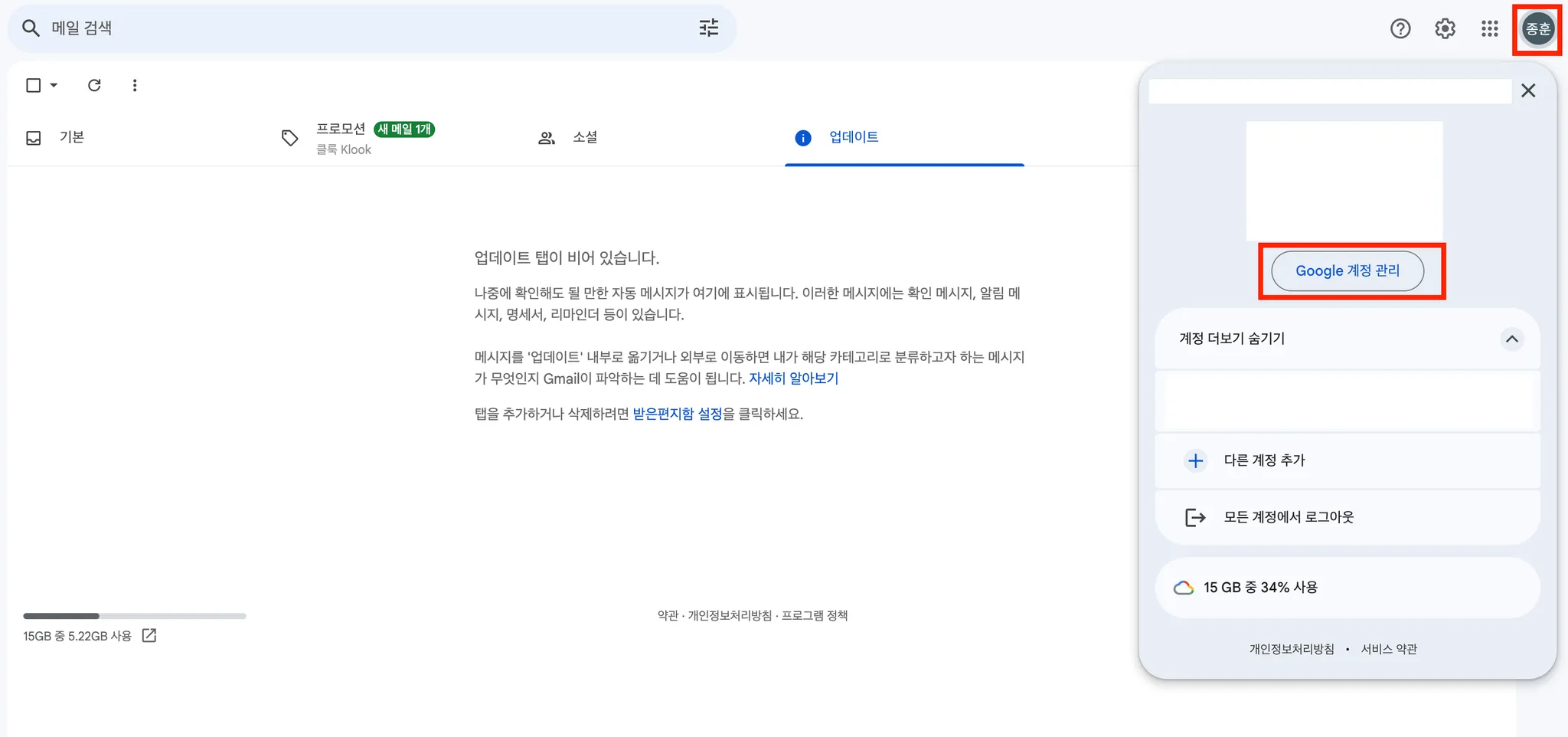 1. 프로필 선택 > Google 계정 관리를 선택합니다.