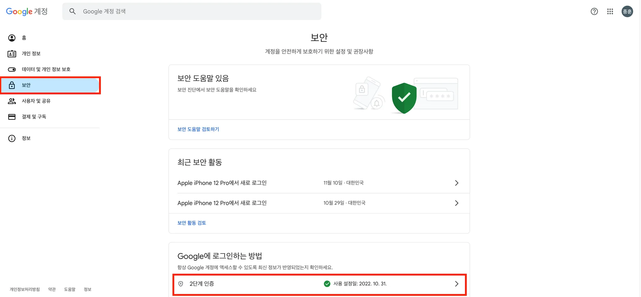 2. 보안 탭 > 2단계 인증을 선택하여 인증을 수행합니다.