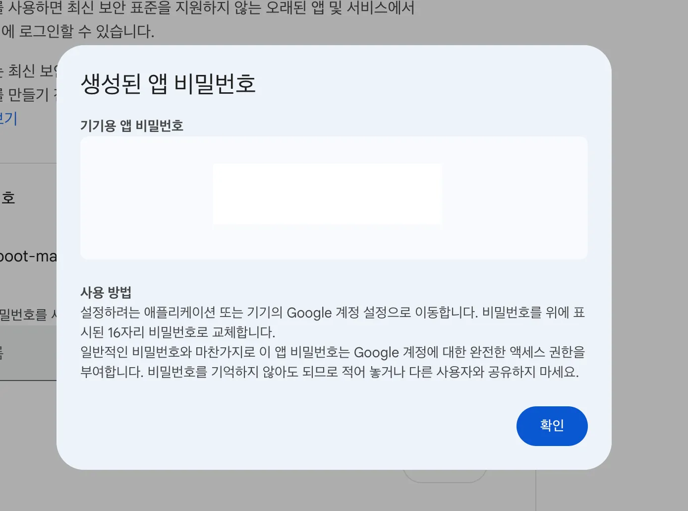 5. 아래와 같이 앱 비밀번호가 생성이 됩니다. 앱 비밀번호는 복사를 해둡니다.