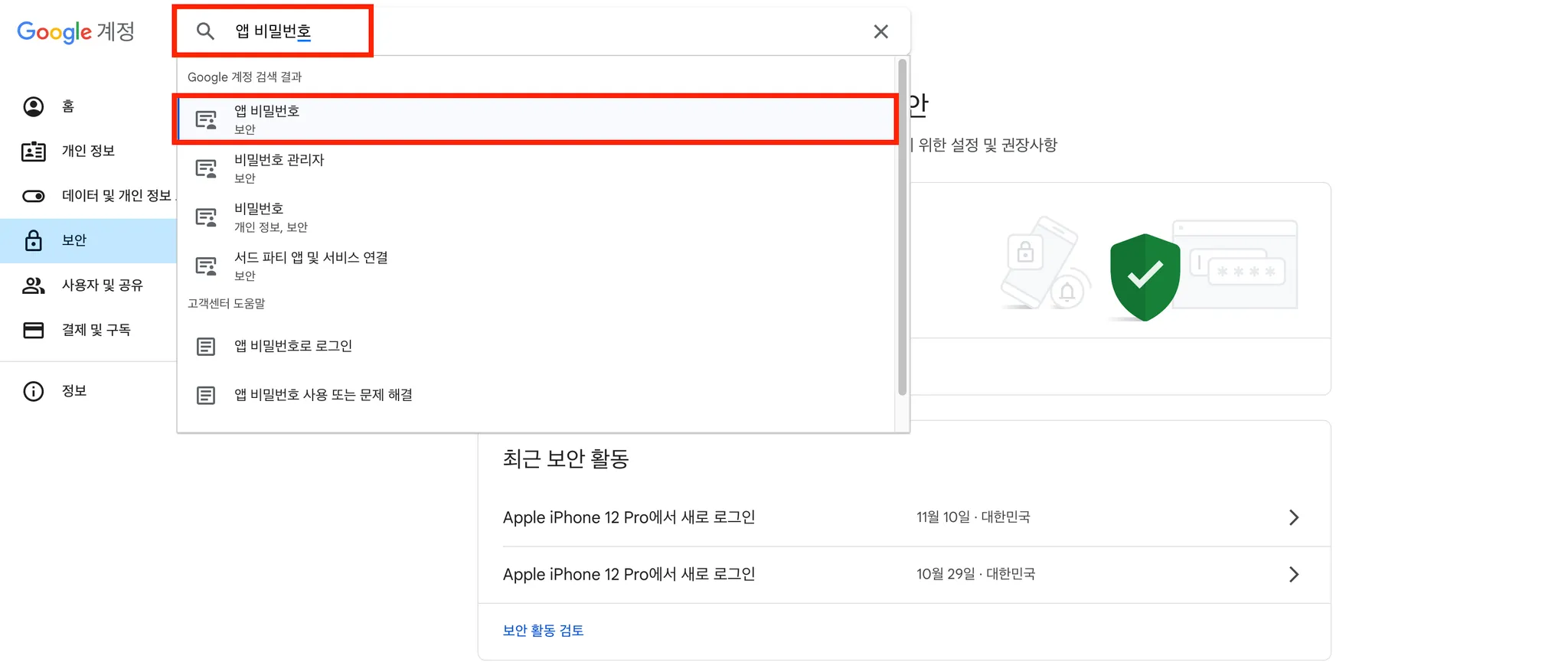3. 인증을 마친 뒤 ‘앱 비밀번호’로 검색하여 선택합니다.