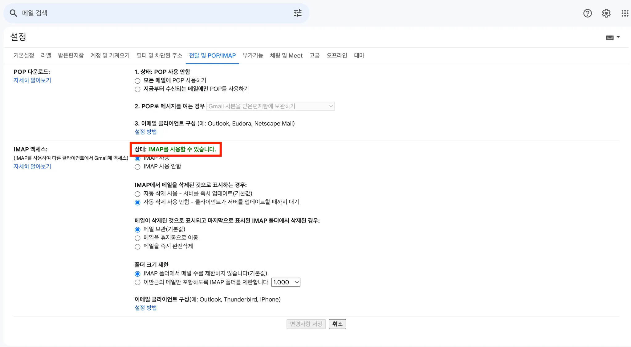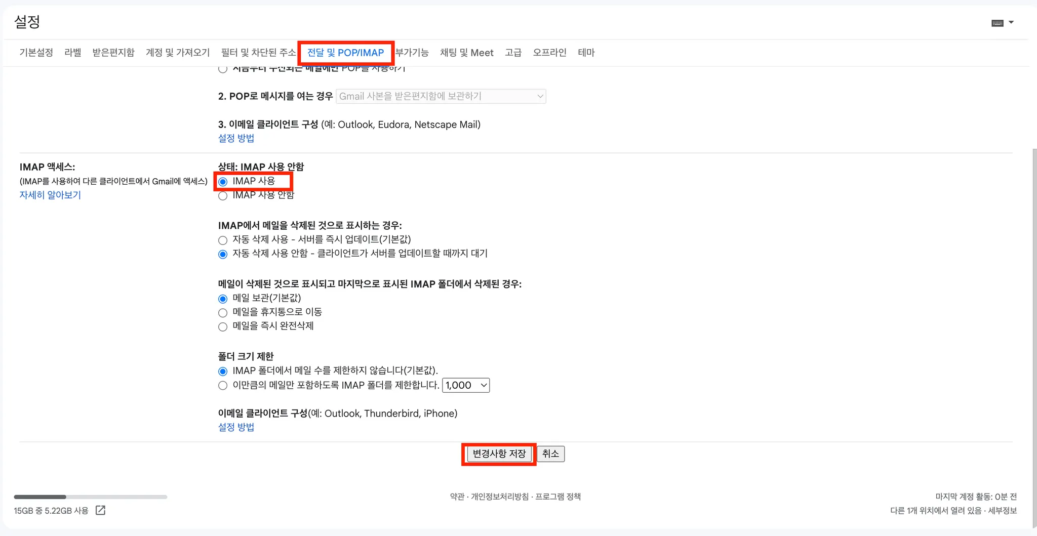 2. 설정 페이지 내에서 ‘전달 및 POP/IMAP’ 탭 선택 > IMAP 액세스를 사용으로 선택하고 ‘변경사항 저장’ 버튼을 누릅니다.