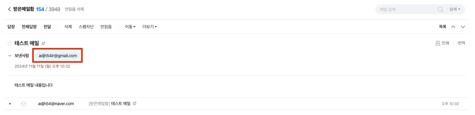 4. 수신자 SMTP 서버 전달 - 발신자의 SMTP 서버가 수신자의 SMTP 서버로 메시지를 전달합니다.