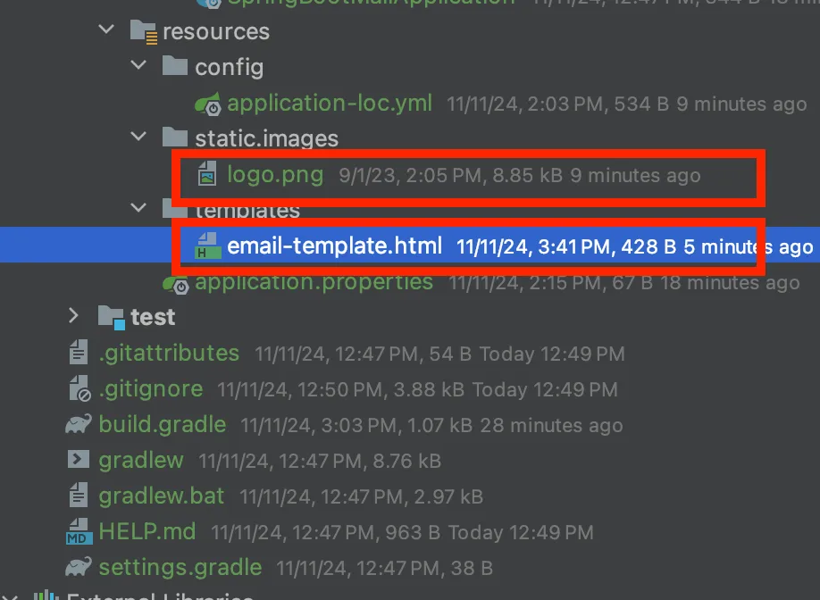 - themelaf는 기본적인 설정을 하지 않는다면, resources/templates를 기본 경로로 인식을 하기에, 기본 경로에 email-template.html이라는 파일을 구성하였습니다. - static/images 경로에 logo.png 파일을 추가하여 프로젝트 내의 이미지를 메일에 포함하도록 구성하였습니다.