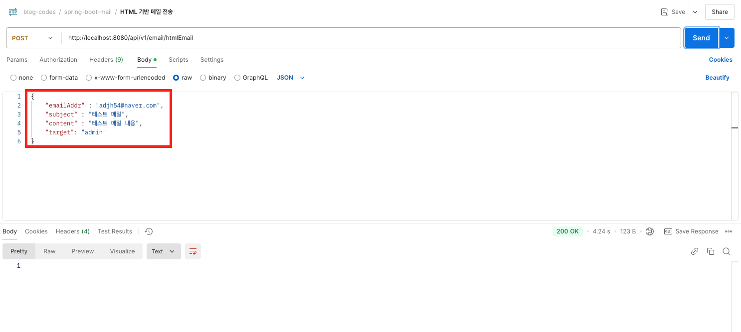 - Controller 부분은 제외하였지만, 해당 서비스를 호출하여 데이터를 전달하는 구조로 되어 있습니다. - @requestBody로 아래와 같은 객체 형태로 데이터를 전달하면 이메일이 전송됩니다.