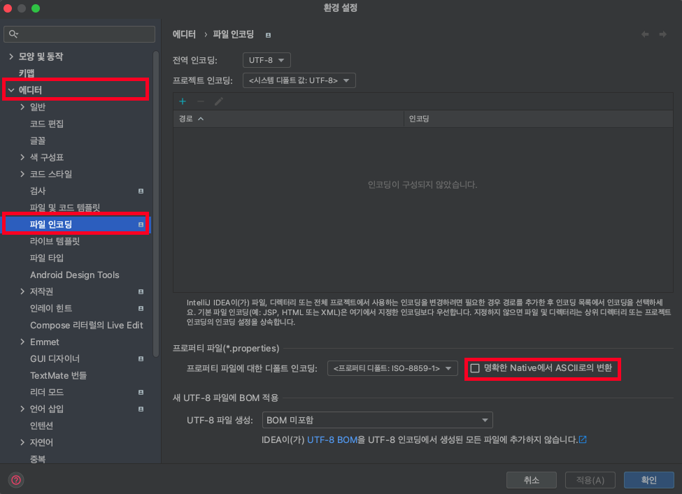 2. 에디터(Editor) 탭 - 파일 인코딩(File Encoding) 탭- 명확한 Native에서 ASCII로 변환(Transparent native-to-ascii conversion)을 체크합니다.