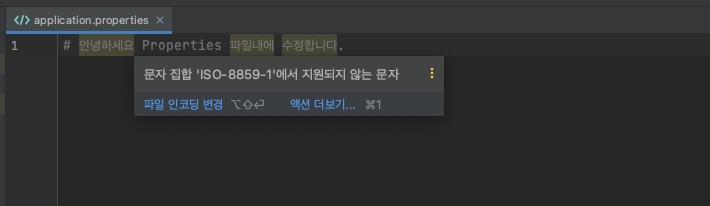 💡 *.properties 파일 내에서 한글을 입력하는 경우 아래와 같이 문자 집합 'ISO-8859-1'에서 지원되지 않는 문자(Characters not supported in character set 'ISO-8859-1')라는 경고 메시지가 나오는 문제가 발생하였습니다.