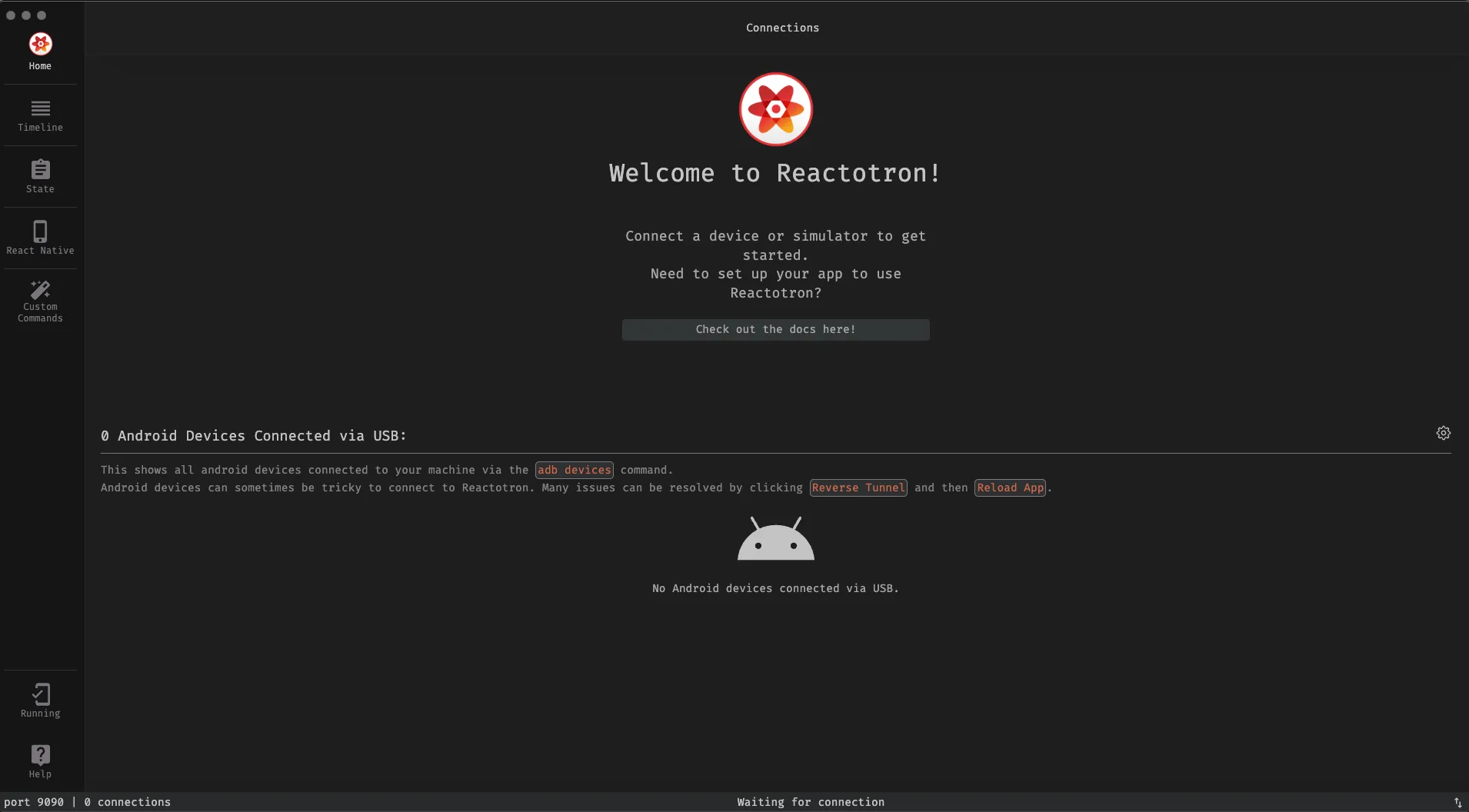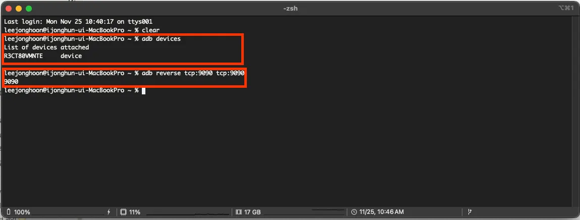 💡 안드로이드의 디바이스를 이용하는 경우 포트포워딩을 해줍니다. - 안드로이드 디바이스를 사용하는 경우는 안드로이드 기기의 포트를 포트포워딩을 통해서 9090 포트로 연결을 해주어야 합니다. - 이는 Reactotro이 통신할 수 있도록 안드로이드 디바이스와 Reactotron를 설정하는 필수적인 단계입니다. - 디바이스를 연결한 뒤 아래의 명령어를 통해서 포트포워딩을 수행합니다.