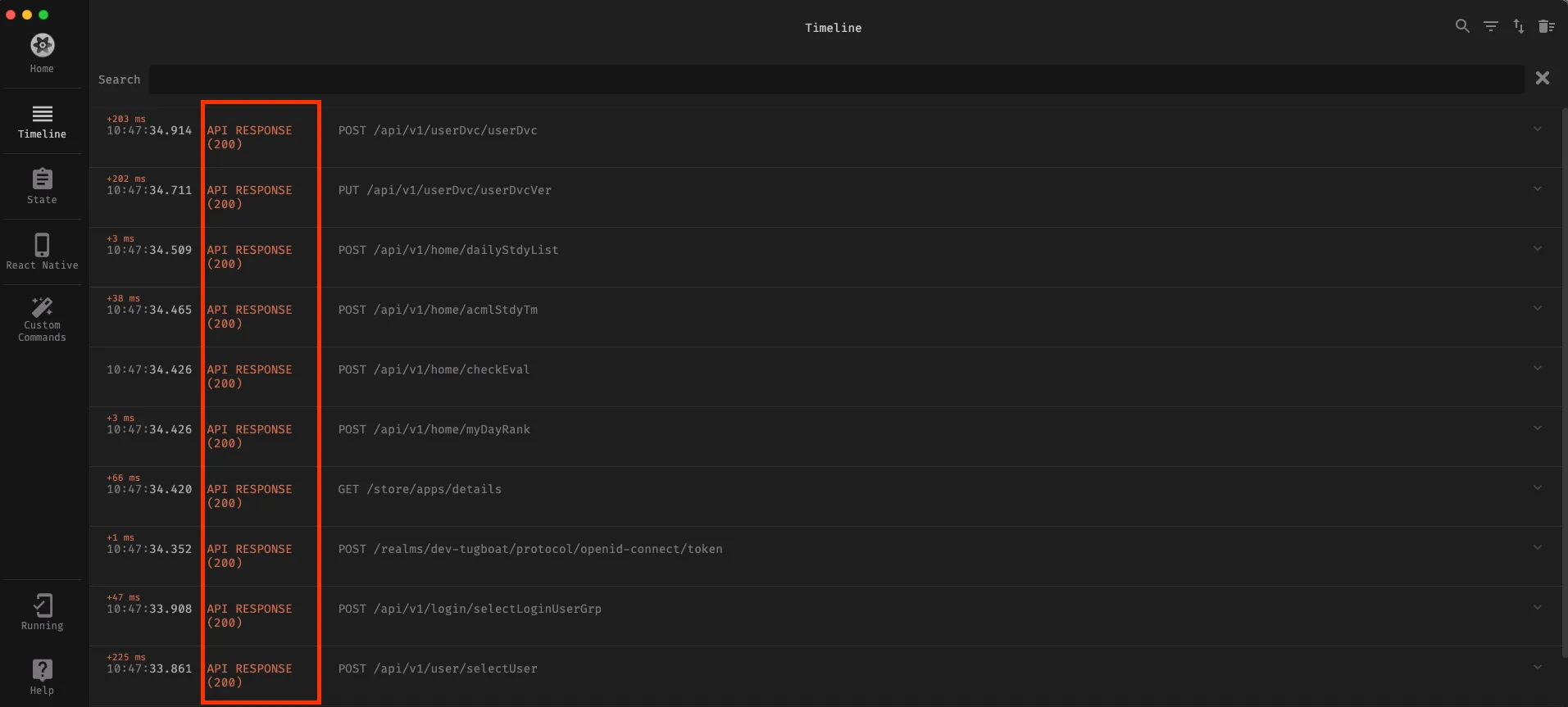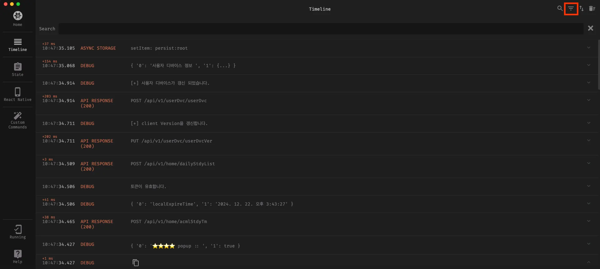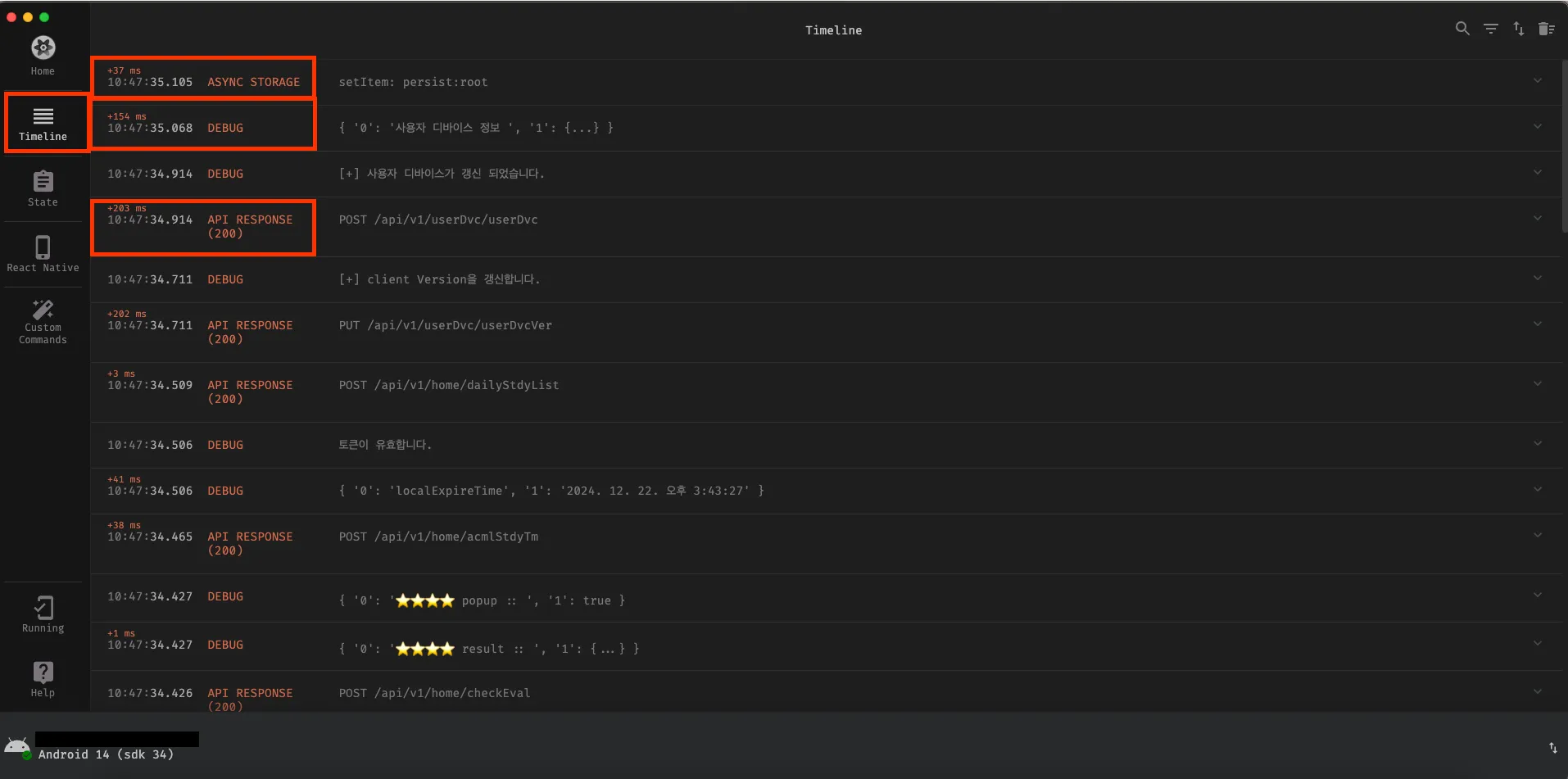 - 위에서 지정한 Redux(Async Storage)와 API Response에 대한 로그 및 일반 DEBUG에 대해서 출력이 됨을 확인하였습니다.