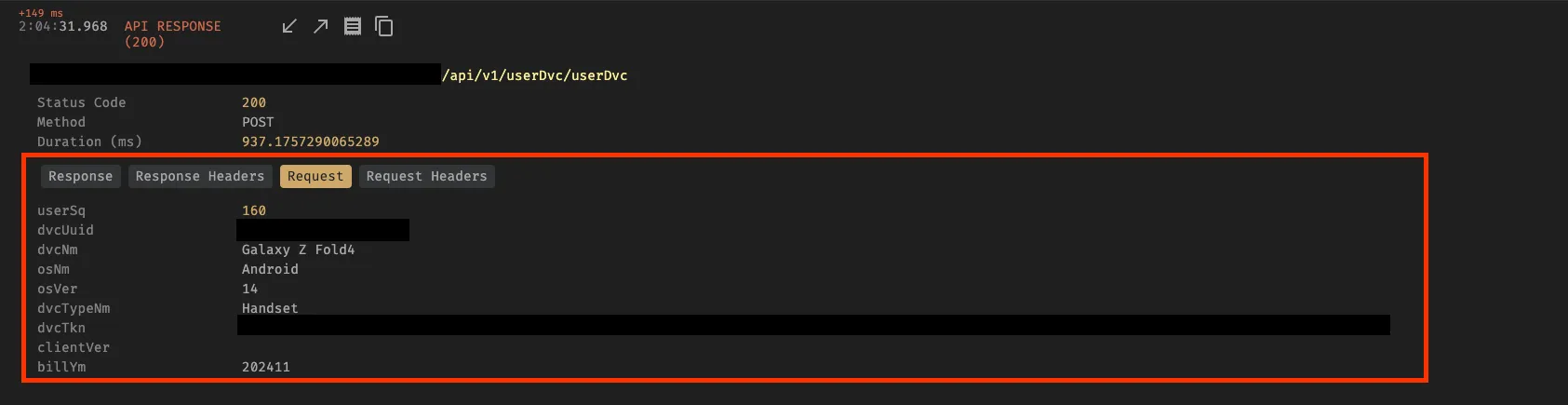 - 아래와 같이 데이터 통신 엔드포인트와 요청/응답 시간, 요청 시 사용했던 값을 아래와 같이 확인 할 수 있습니다.