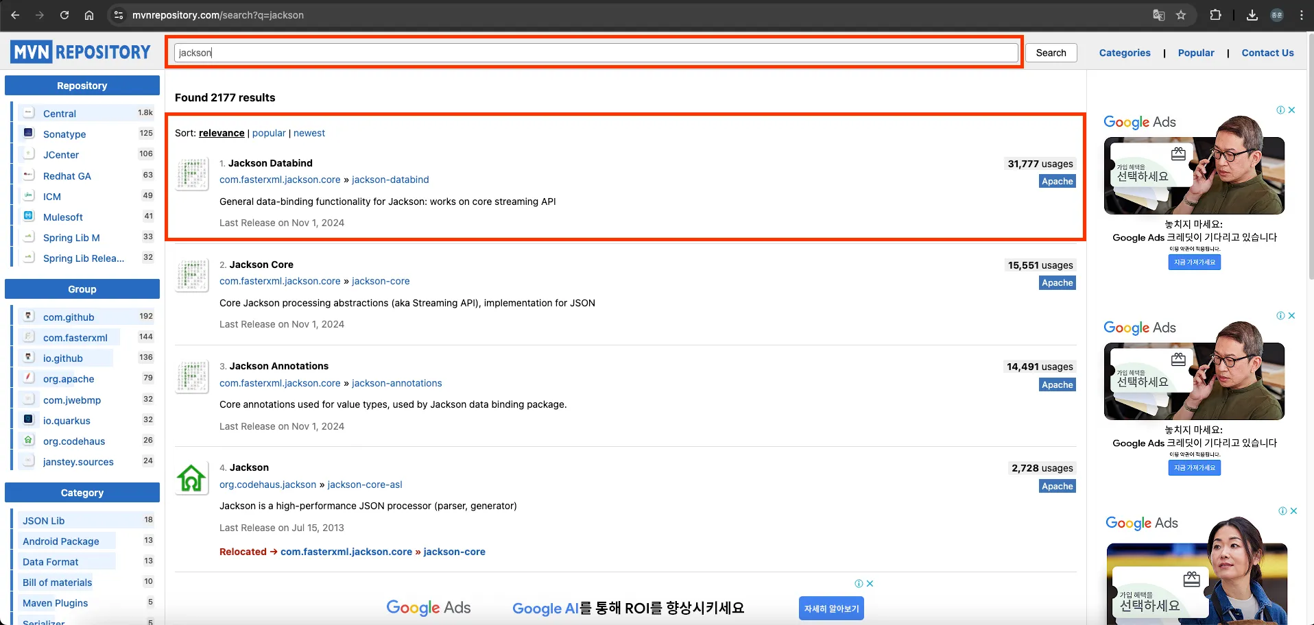 💡 의존성 확인하기 - Spring Boot Starter로 제공되는 라이브러리 외에 오픈소스로 제공되는 라이브러리를 사용하기 위해서는 다른 방법을 취해야 합니다.