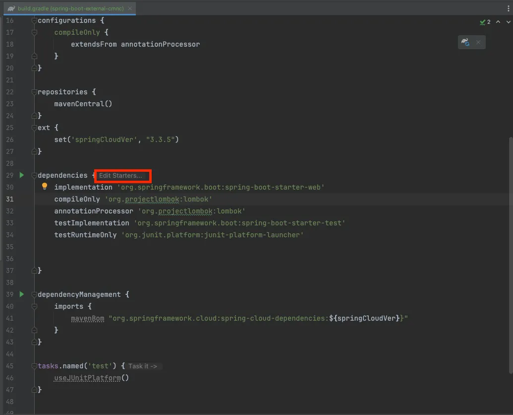 3) IntelliJ에서 spring starter initializr로 의존성 추가 -1 : Edit Starters.. 버튼