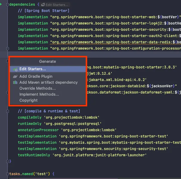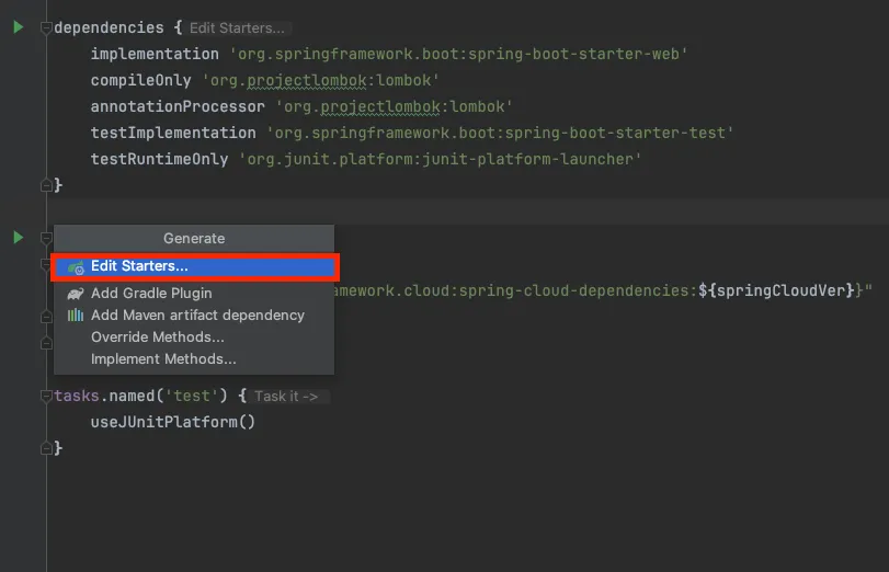 4) IntelliJ에서 spring starter initializr로 의존성 추가 -2 : Generate.. > Edit Starters.. 버튼 선택