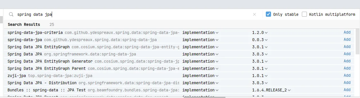 - 기존 버전에서는 아래와 같이 ‘Add dependency..’라는 메뉴가 있어서 아래와 같이 검색이 가능하였지만, 최신버전에서는 사라진 것 같습니다.
