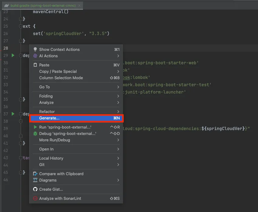 1. build.gradle 파일 내에 오른쪽 마우스 > Generate.. 버튼을 누릅니다.