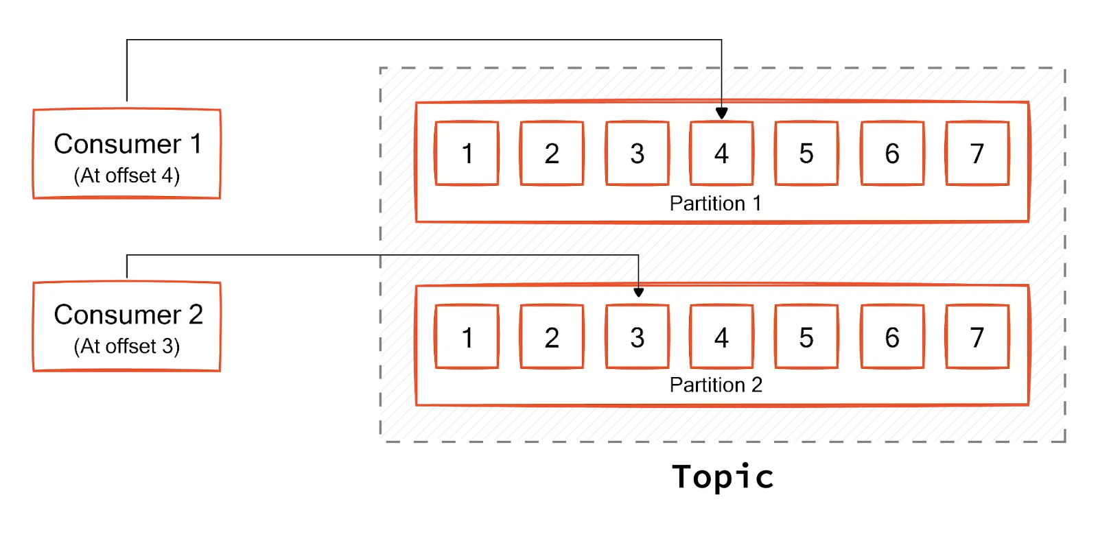 - 파티션 내에서 각 메시지를 고유하게 식별하는 순차적인 ID 번호입니다. - 파티션 내에서 순차적으로 증가하는 정수값으로, 메시지의 위치를 나타냅니다. - Consumer가 어디까지 메시지를 읽었는지 추적하는 데 사용됩니다.
