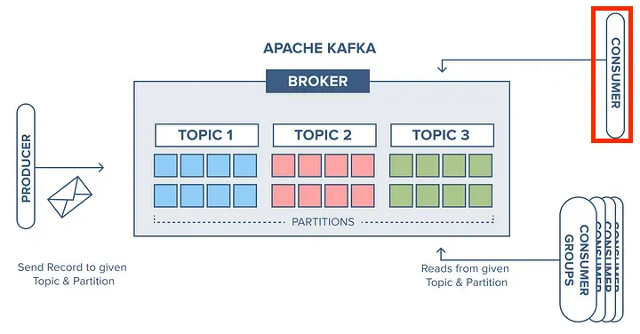 - Kafka Topic으로부터 메시지를 구독(Subscribe)하고 읽어오는 애플리케이션이나 서비스를 의미합니다. - 하나 이상의 토픽을 구독(Subscribe)하여 메시지를 지속적으로 소비합니다. 구독 과정에서 특정 토픽의 파티션에 할당되어 메시지를 읽어옵니다. - Consumer Group을 통해 여러 Consumer가 협력하여 병렬 처리가 가능합니다.