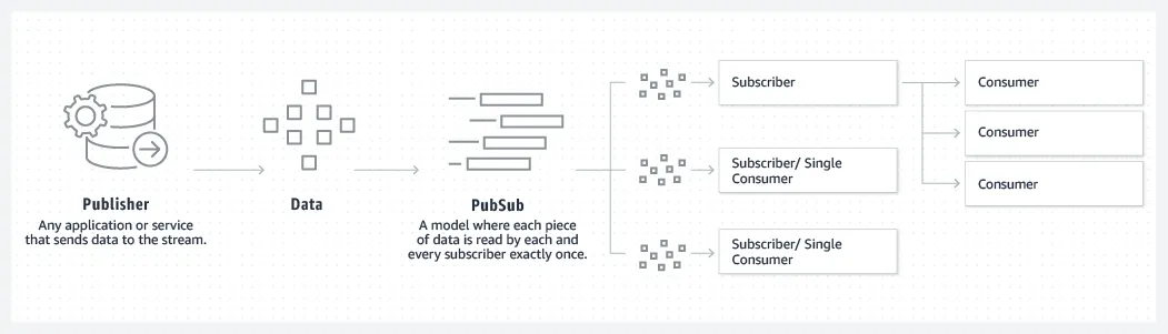 2. PubSub(Publisher Subsciber) → 구독자(Subscriber) - 발행된 스트림 데이터는 이를 구독(Subscribe)하고 있던 모든 구독자(Subsciber)에게 전달이 됩니다. - 전달된 구독자는 Single Consumer에게 전달되거나 혹은 여러 Consumer(Consumer Group)에게 다시 전달이 됩니다.