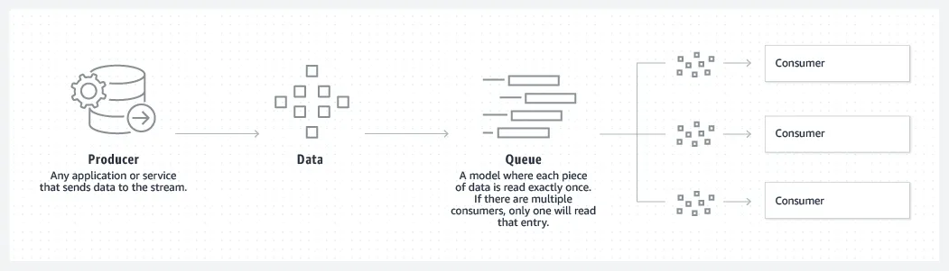 💡 대기열(Queue) 모델 처리 과정 1. 생성자(Producer) → 데이터(Data) → 대기열(Queue) - 생성자는 애플리케이션이나 서비스를 의미하며, 대기열(Queue)로 스트림 데이터를 전송합니다. - 전송된 데이터는 대기열(Queue)에 FIFO(First In First Out) 형태로 순차적으로 적재가 됩니다.