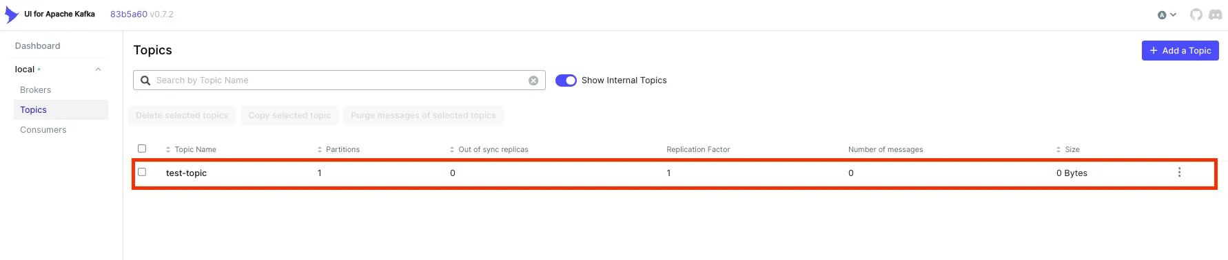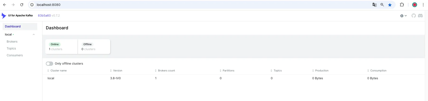 - 위에서 구성한 Docker Compose의 서비스로 Kafka UI를 확인할 수 있습니다