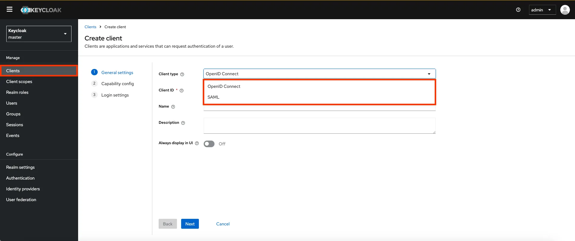 - keycloak이 클라이언트 애플리케이션과 통신하는 데 사용하는 데 사용하는 프로토콜을 선택합니다. - 주로 OpenID Connect와 SAML 두 가지 프로토콜을 지원하며, 각각의 프로토콜은 서로 다른 사용 사례와 장단점을 가지고 있습니다.