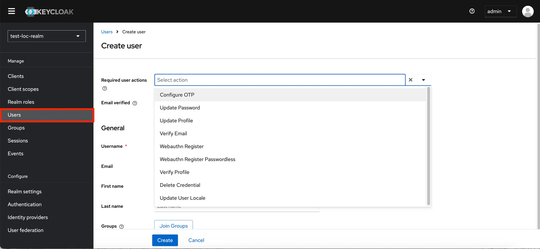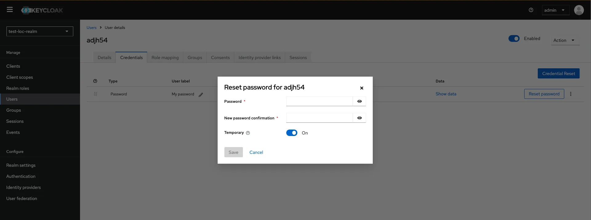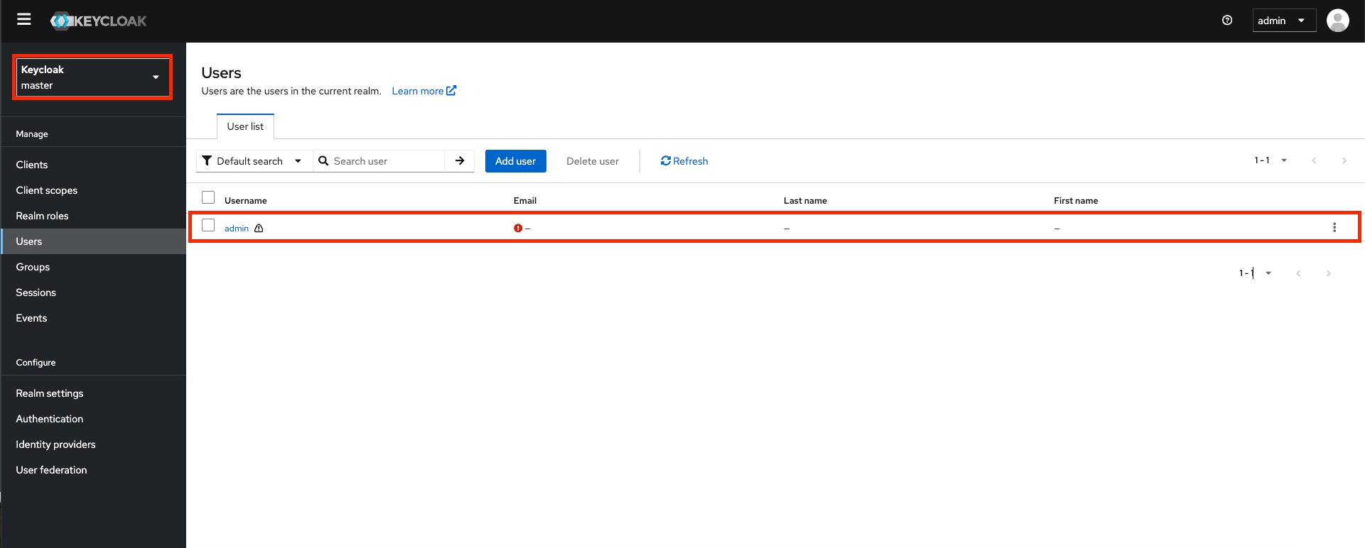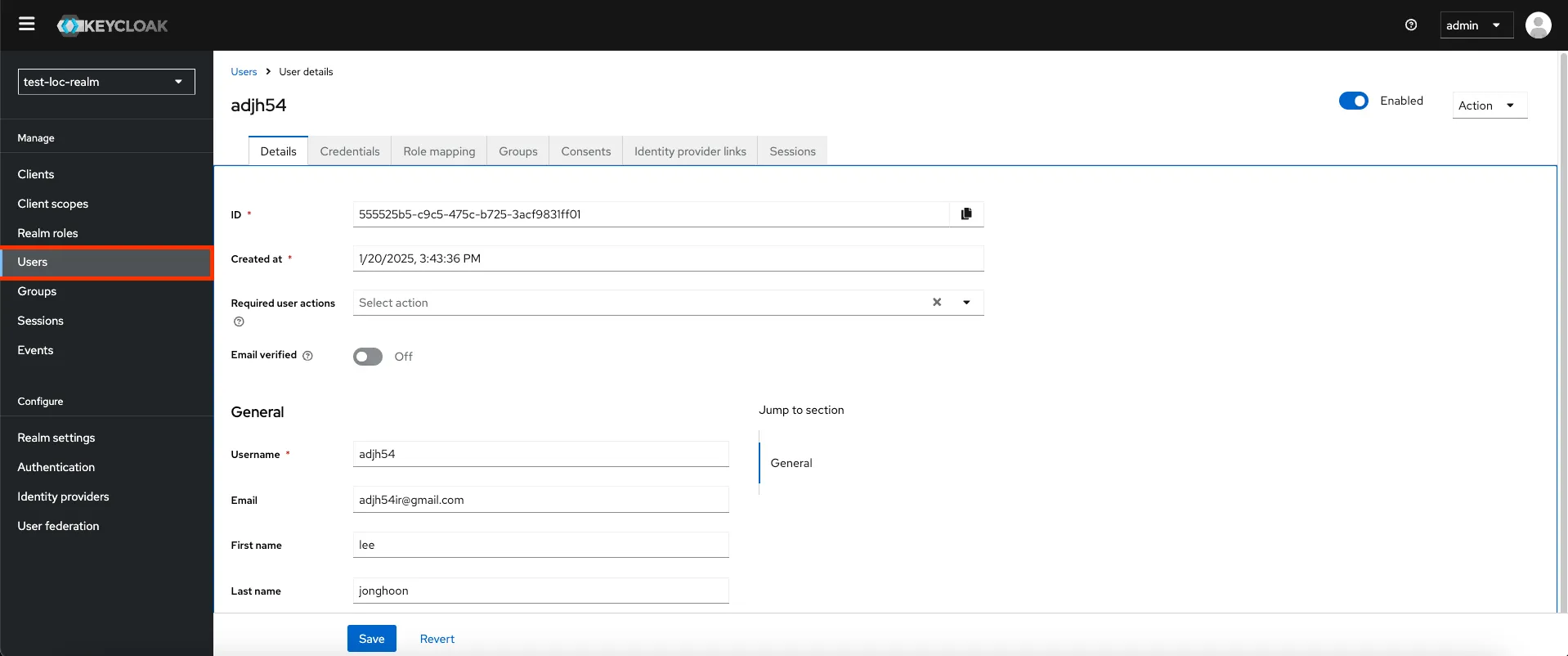 💡 Users - Keycloak에서 관리되는 최종 사용자(End Users)를 의미합니다. 각 사용자는 하나 이상의 Realm에 속하며 각각 다른 역할과 권한을 가질 수 있습니다.