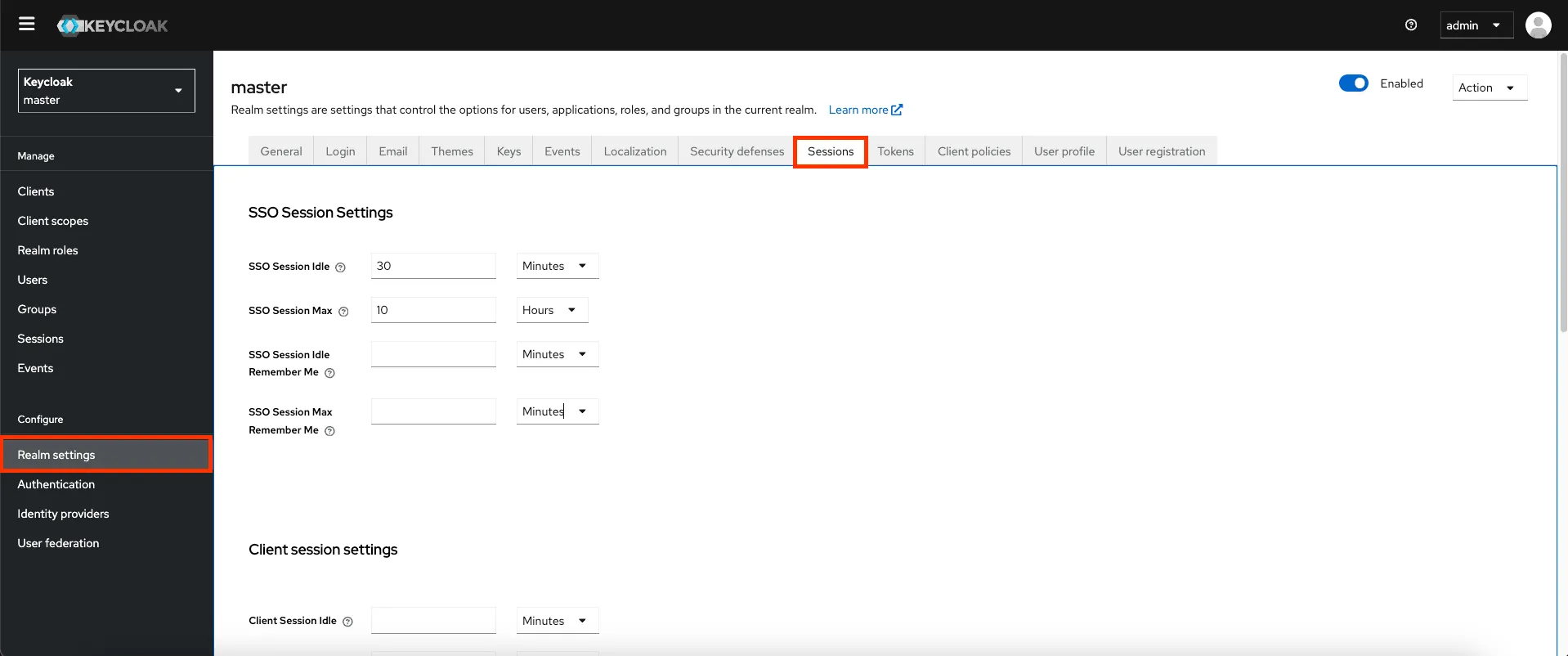 - 각 클라이언트(애플리케이션) 별로 세션을 관리하기 위한 설정입니다. 이러한 설정은 각 클라이언트별로 독립적으로 적용되며, Realm의 전체 SSO 세션 설정과는 별개로 동작합니다. 클라이언트별로 더 엄격하거나 유연한 세션 정책을 적용할 수 있습니다.