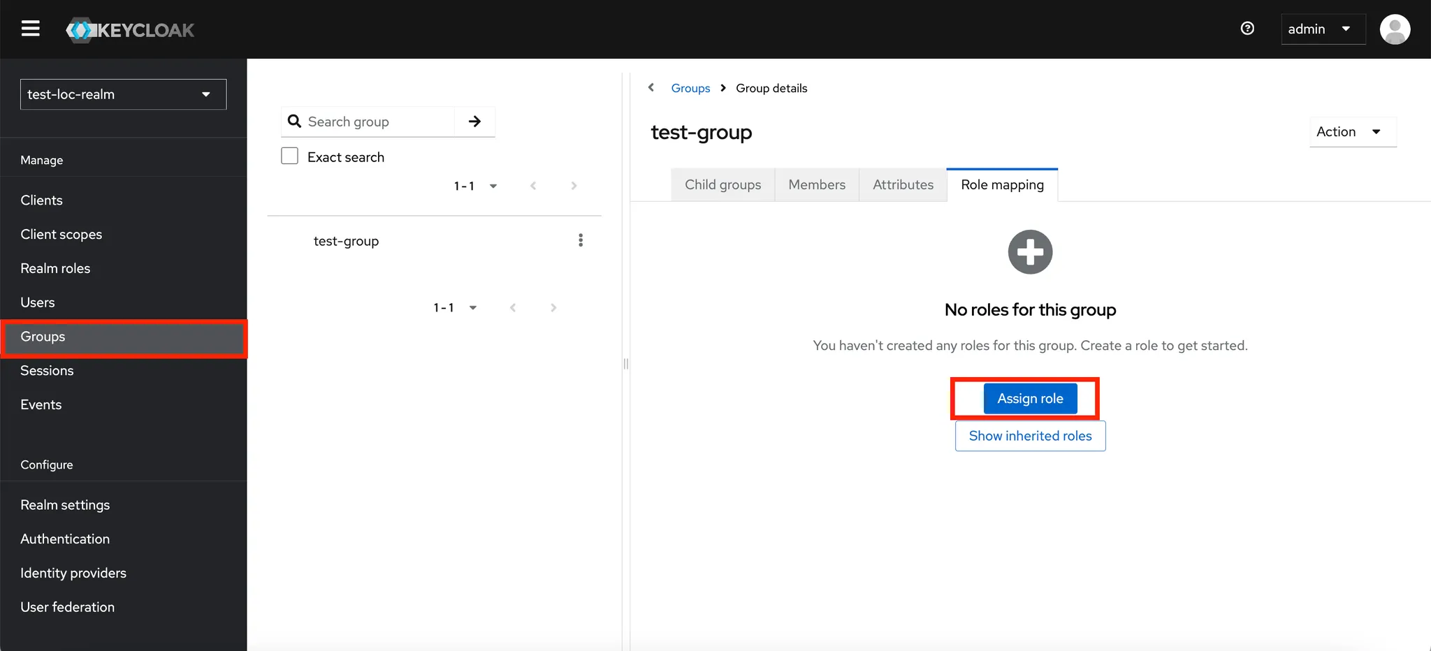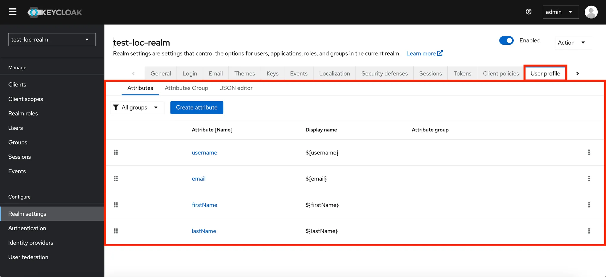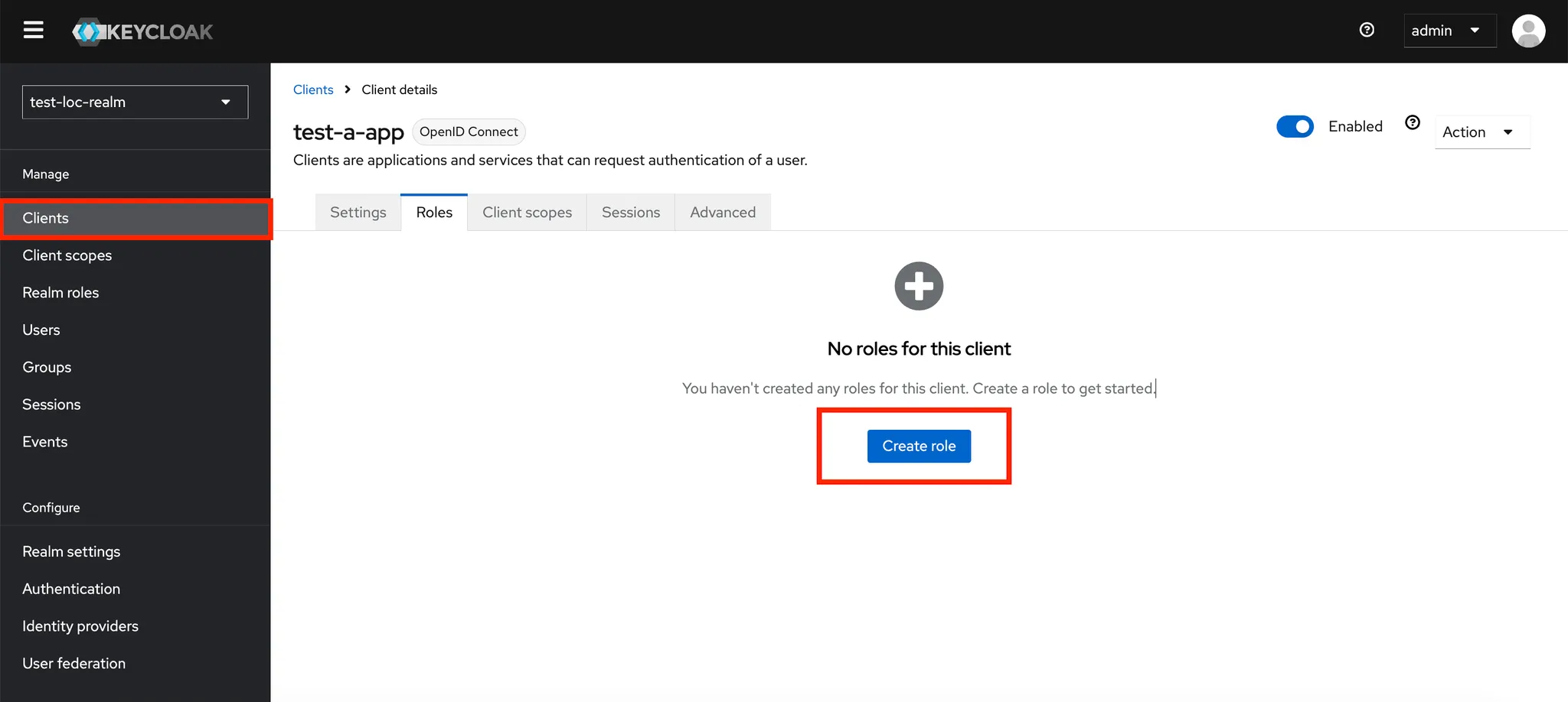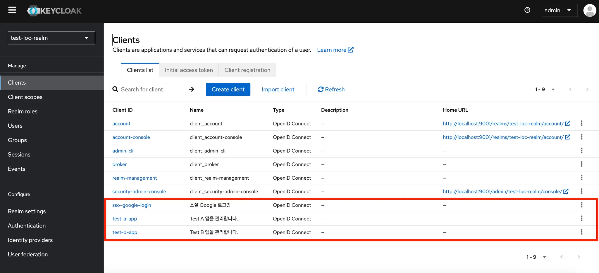 💡 아래와 같이 test-loc-realm이라는 공간 내에 Client를 분리하여서 사용합니다.