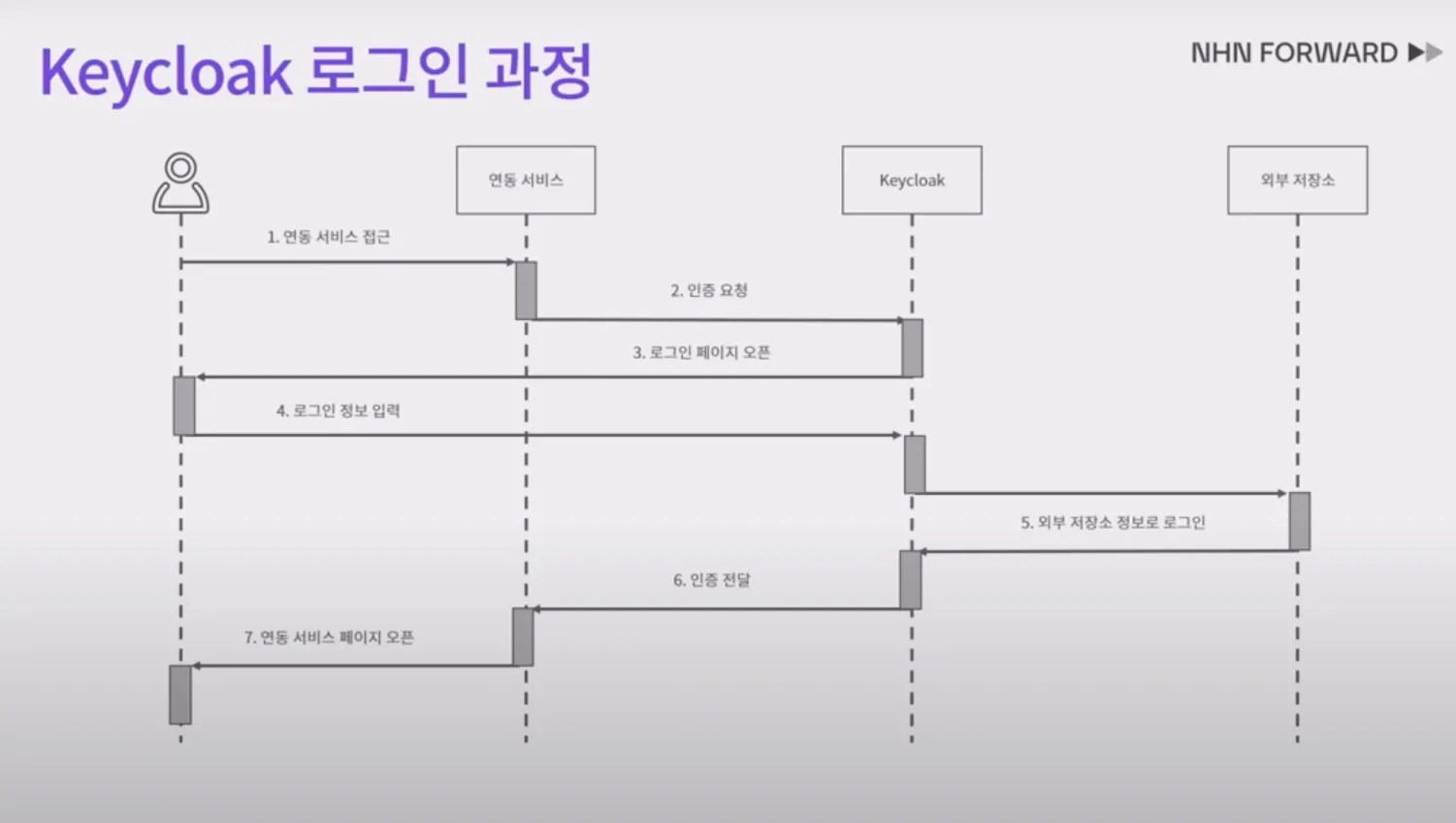 5. 외부 저장소 정보로 로그인 : Keycloak → 외부 저장소 → Keycloak - 인증 정보를 기반으로 외부 저장소로부터 자격 증명을 검증하고 성공적으로 인증되면 액세스 토큰을 발급합니다.