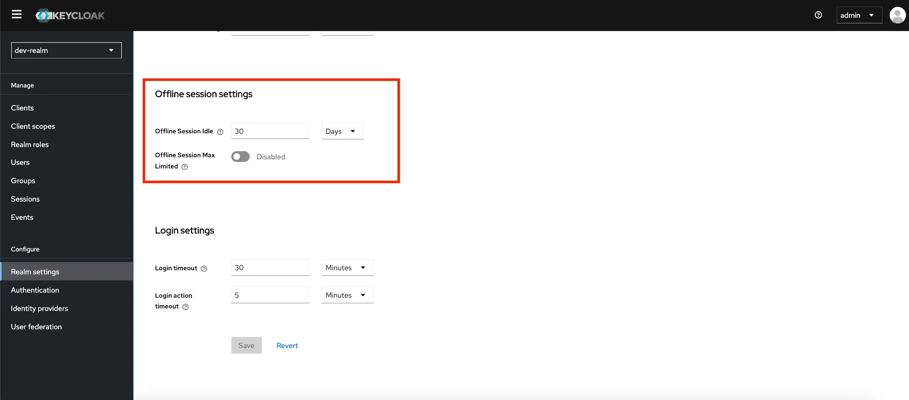 오프라인 세션의 유휴 시간을 일(Days) 단위로 설정합니다. 설정된 기간 동안 사용자 활동이 없으면 오프라인 세션이 만료됩니다.
