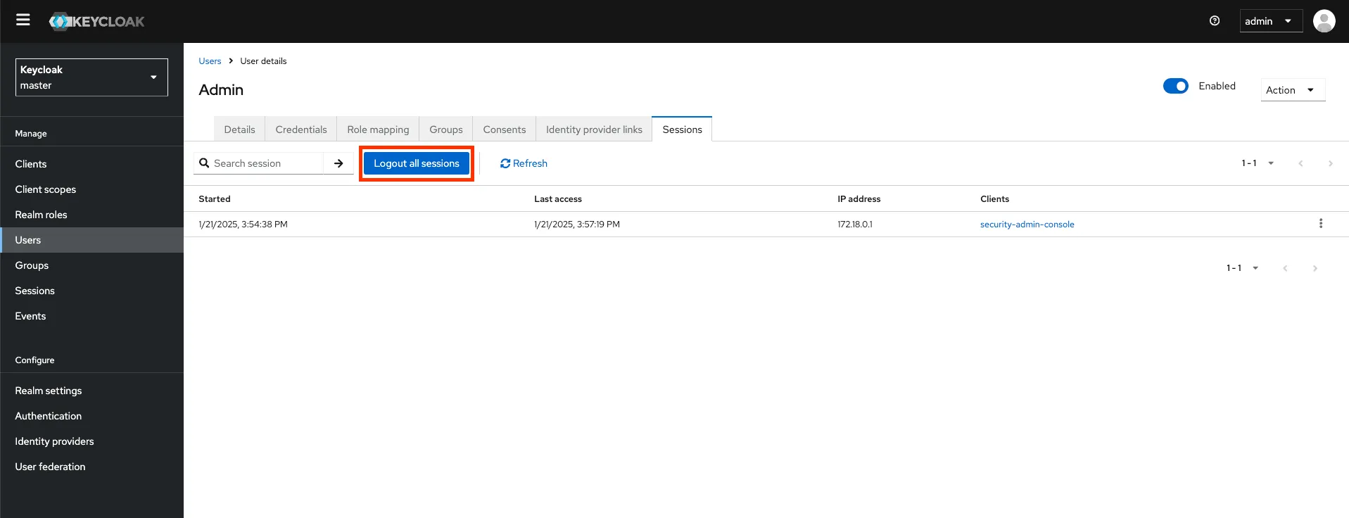 - 사용자 별로 연결된 모든 세션에 대해서 단일 로그아웃을 수행할 수 있습니다. - 또한, Keycloak API를 통해서 일괄 로그아웃을 수행할 수 있습니다.